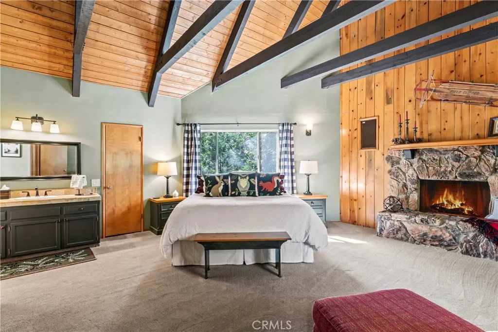 Impeccable Pride of Ownership on this Lake Arrowhead Mountain Retreat located in Arrowhead Woods with LAKE RIGHTS that beckons your full attention at an irresistible price of $279.00 per sqft and nestled on a 13,000 sqft Wooded Lot! Located on a quiet Cul-de-Sac, find this totally "Unassuming Treasure" of a Home with Direct Level Entry 1.5 Car Garage into this Super Spacious 2,579 sqft Home with an "Open Entertaining Floorplan" more than ideal for Family and Guests with a Fireplace on Every Level of this Meticulous 3-Story Residence. Main Mid-Floor Features: Boasting all Easy Clean Tiled Flooring, Over-sized Exposed Wood Beamed Ceilings with Tongue and Groove Knotty Pine Walls that Glow the Color of Honey, Laundry Room with Side-by-Side GE Washer & Dryer that doubles as Powder Room, Granite Kitchen Counters with Barstool Seating, Pantry Closet, all Open to Informal Dining and Living Room Combo with Rock Fireplace that leads to Outdoor Patio Entertaining Deck. Upper Carpeted Level Features: An Enormous Primary En-suite with Wood Beamed Ceiling, Rock Fireplace, Soaking Tub and Seamless Glass Tile Shower, Separate Sink Area with Expansive Closet. Additionally, there are 2 Spacious Guest Bedrooms with Vaulted Beamed Ceilings, and an additional Quaint Sleeping Loft for the over-flow youngsters that are seeking a Sleeping Adventure to share whispering stories amongst themselves. Lower-Level Features: All carpeted spacious Game Room with Pool Table, Card Table Area, Wet Bar with Seating, Rock Fireplace, with Sleeper Sofa for those that that just wish to watch the fire and fall asleep knowing that the rest of the household is content and on their way to do the same. Furnishings available and Hello Lake Arrowhead Lifestyle !!
