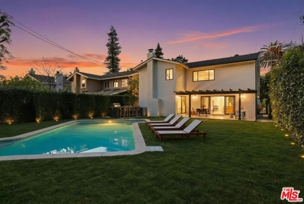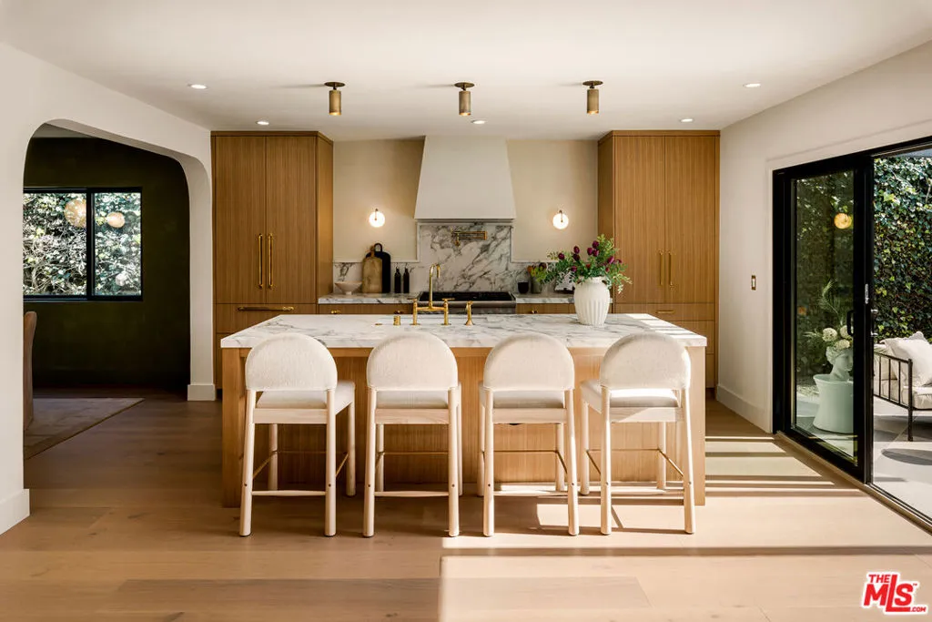 Some homes are built. Others are crafted. This Hidden Woods Haven in Sherman Oaks is the latter. Designed and built by a husband-and-wife team as a personal project, not a flip, this home reflects time, intention, and a love for organic, thoughtful design. A limestone fountain welcomes you in, while a limestone fire pit, outdoor kitchen finished in handcrafted zellige tile, and sculptural olive tree create inviting spaces for gathering. A large grass lawn stretches to the pool, offering the perfect setting for entertaining, play, or quiet afternoons at home. An outdoor pool bathroom adds both ease and functionality. Inside, a soaring entry sets a warm, airy tone. Wide-plank oak floors run throughout, complemented by Roman clay and limewash walls that add subtle texture and depth. Natural materials limestone, oak, handcrafted tile, alabaster, and raw brass were selected to age beautifully over time. The kitchen anchors the home with custom oak cabinetry, Thermador appliances, and a generous walk-in pantry designed for everyday living. The primary suite feels calm and private, with a spa-like bath finished in limestone and handcrafted zellige tile. Secondary bedrooms and baths maintain the same cohesive, understated aesthetic. A thoughtfully placed second-floor laundry room adds daily convenience. Located in prime Hidden Woods, just minutes to the canyons, the 101 and 405, this home offers rare privacy with easy access to everything. This is more than a house it's a home designed to be lived in and loved for years to come.