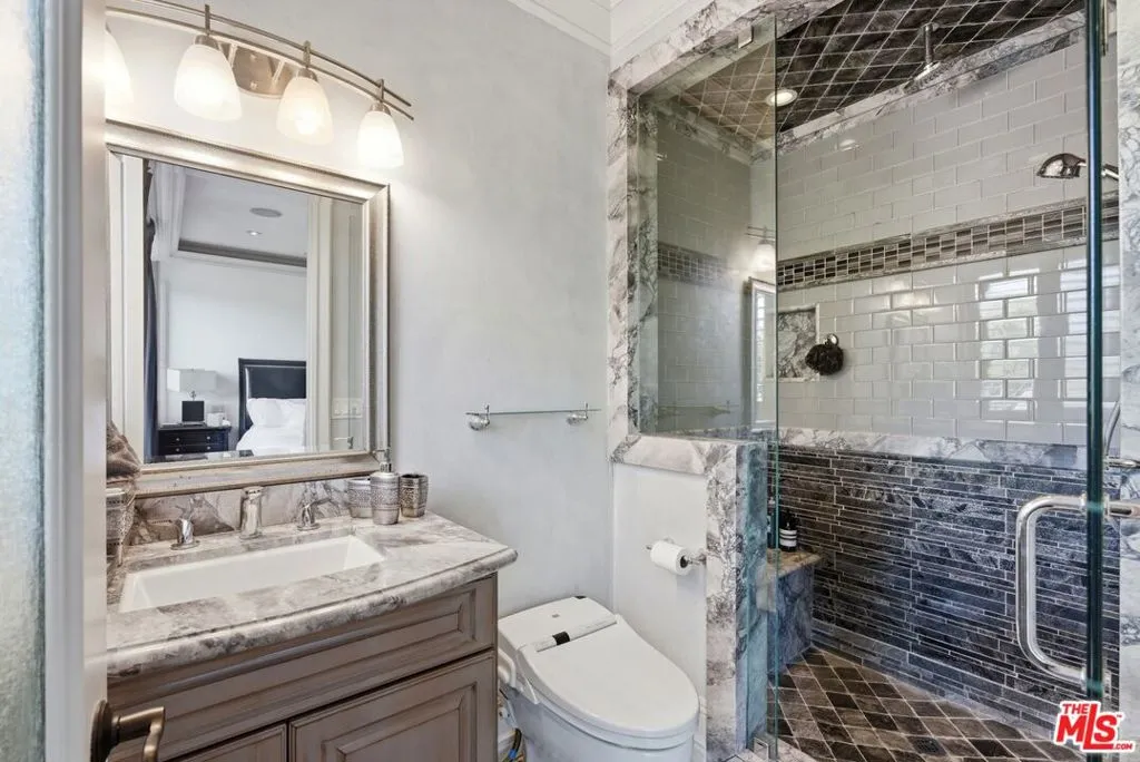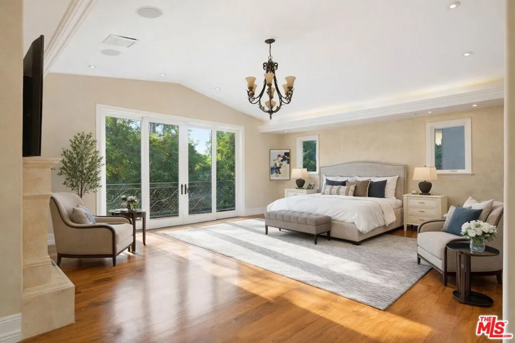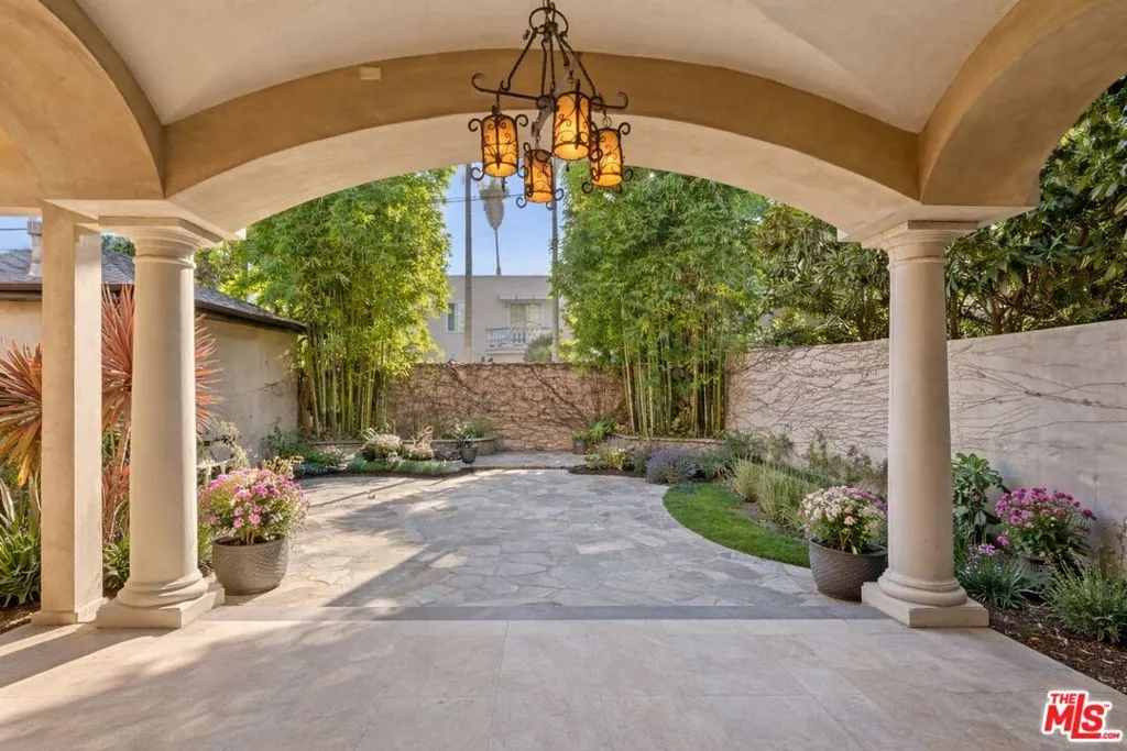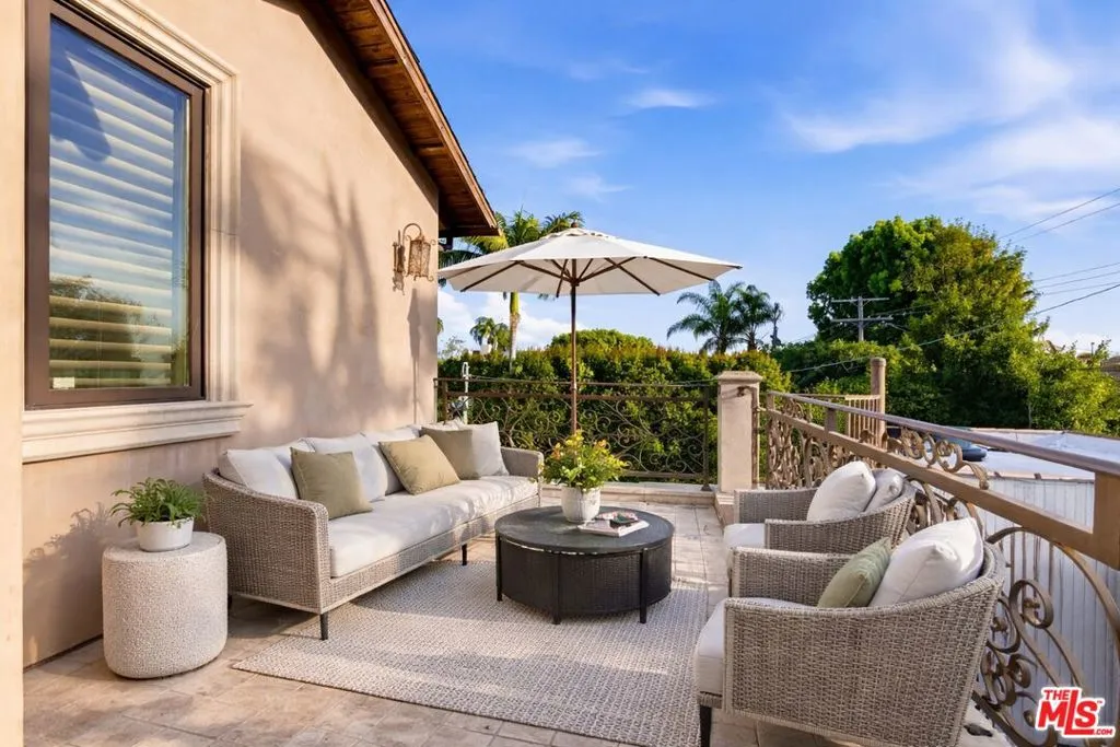 Beautiful Mediterranean custom home offering over 6,000 square feet with 6 bedrooms and 7.5 bathrooms, featuring a spacious open floor plan designed for both comfortable living and elegant entertaining. Ideally located mid-block with a gated front entry and auto-gated flagstone driveway and walkway.Enter through a grand living room that flows seamlessly into the formal dining room and a rear-facing family room with fireplace and French doors opening to a covered patio, tiled yard, and entertainer's outdoor kitchen complete with BBQ and bar area.The oversized chef's kitchen features a large center island, dual sinks, and top-of-the-line stainless steel appliances including a Wolf range with double ovens, wine refrigerator, built-in oversized refrigerator/freezer, and a butler's pantry with warming drawer and microwave. A bright breakfast area overlooks the backyard with direct patio access.A sun-filled staircase leads to the second level where four spacious bedrooms each feature updated marble and tile ensuite bathrooms. Front-facing bedrooms offer balconies with Century City views.The luxurious primary suite includes a fireplace, French doors opening to a private balcony with treetop and sunset views, and a large custom walk-in closet with center island and built-in dressers. The spa-inspired primary bathroom features dual vanities, a soaking tub, and steam shower.The lower level offers a large open game room/den with projector theater, two additional ensuite bedrooms, and a powder room. Additional features include marble and hardwood flooring, Venetian plaster walls, built-in sound system, four-zone HVAC, solar panels, alarm system, and a second-floor laundry room with ample storage. Beautifully maintained and ideally located near Westfield Century City Mall, UCLA, Westwood Village, and Beverly Hills. Convenient amenities near Ralphs, Gelson's, Equinox Sports Club, and Eataly. Located within the Westwood Charter School district. Easy access to 405 and 10 Freeway. *Photos are virtually staged. *Home can be delivered furnished with custom traditional furniture*