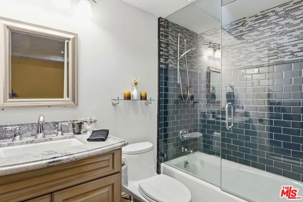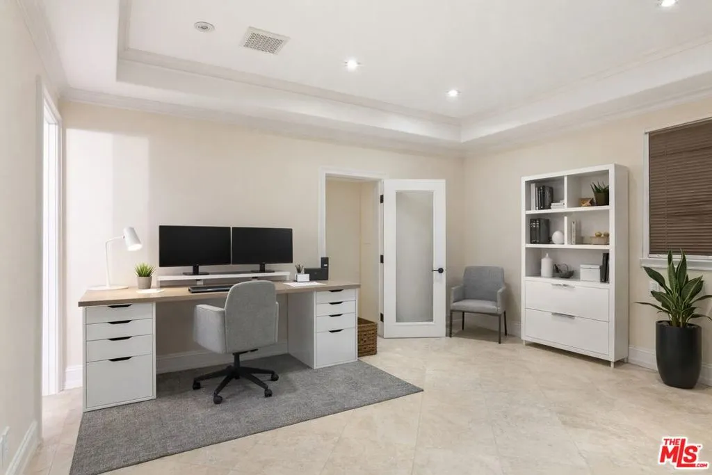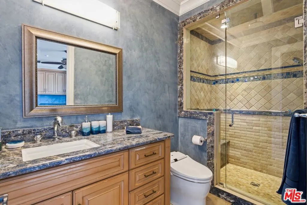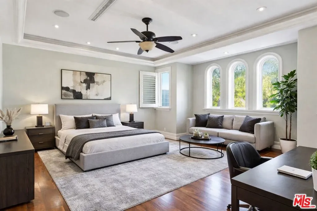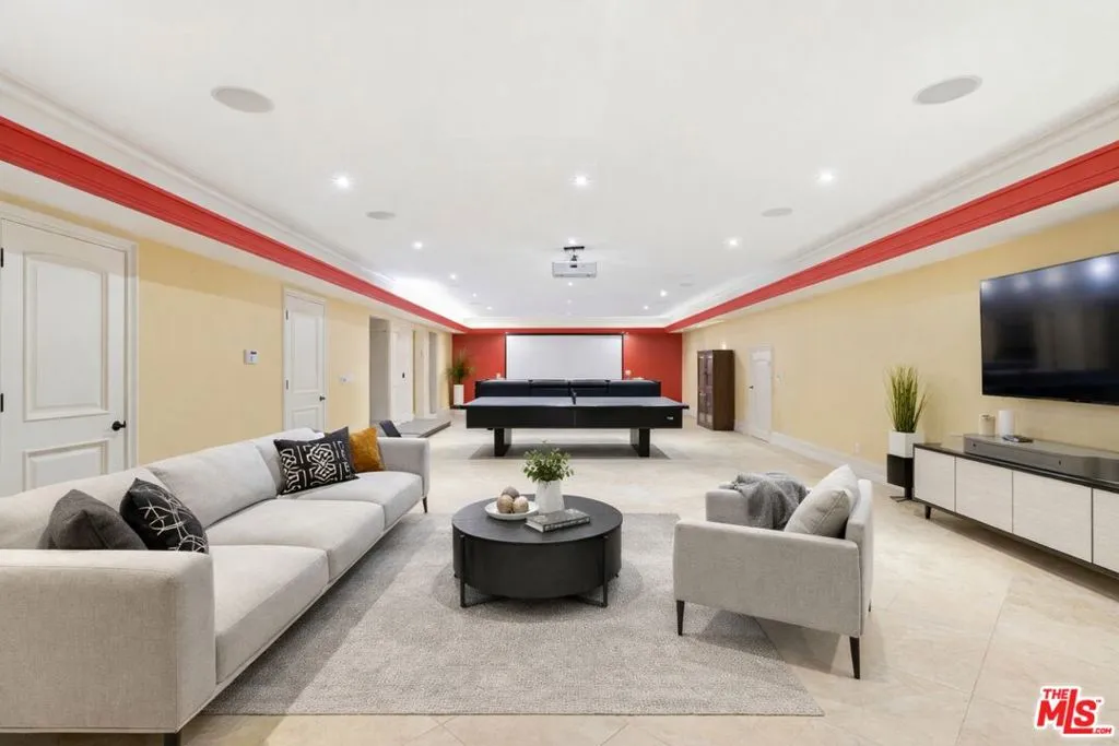 Beautiful Mediterranean custom home offering over 6,000 square feet with 6 bedrooms and 7.5 bathrooms, featuring a spacious open floor plan designed for both comfortable living and elegant entertaining. Ideally located mid-block with a gated front entry and auto-gated flagstone driveway and walkway.Enter through a grand living room that flows seamlessly into the formal dining room and a rear-facing family room with fireplace and French doors opening to a covered patio, tiled yard, and entertainer's outdoor kitchen complete with BBQ and bar area.The oversized chef's kitchen features a large center island, dual sinks, and top-of-the-line stainless steel appliances including a Wolf range with double ovens, wine refrigerator, built-in oversized refrigerator/freezer, and a butler's pantry with warming drawer and microwave. A bright breakfast area overlooks the backyard with direct patio access.A sun-filled staircase leads to the second level where four spacious bedrooms each feature updated marble and tile ensuite bathrooms. Front-facing bedrooms offer balconies with Century City views.The luxurious primary suite includes a fireplace, French doors opening to a private balcony with treetop and sunset views, and a large custom walk-in closet with center island and built-in dressers. The spa-inspired primary bathroom features dual vanities, a soaking tub, and steam shower.The lower level offers a large open game room/den with projector theater, two additional ensuite bedrooms, and a powder room. Additional features include marble and hardwood flooring, Venetian plaster walls, built-in sound system, four-zone HVAC, solar panels, alarm system, and a second-floor laundry room with ample storage. Beautifully maintained and ideally located near Westfield Century City Mall, UCLA, Westwood Village, and Beverly Hills. Convenient amenities near Ralphs, Gelson's, Equinox Sports Club, and Eataly. Located within the Westwood Charter School district. Easy access to 405 and 10 Freeway. *Photos are virtually staged. *Home can be delivered furnished with custom traditional furniture*