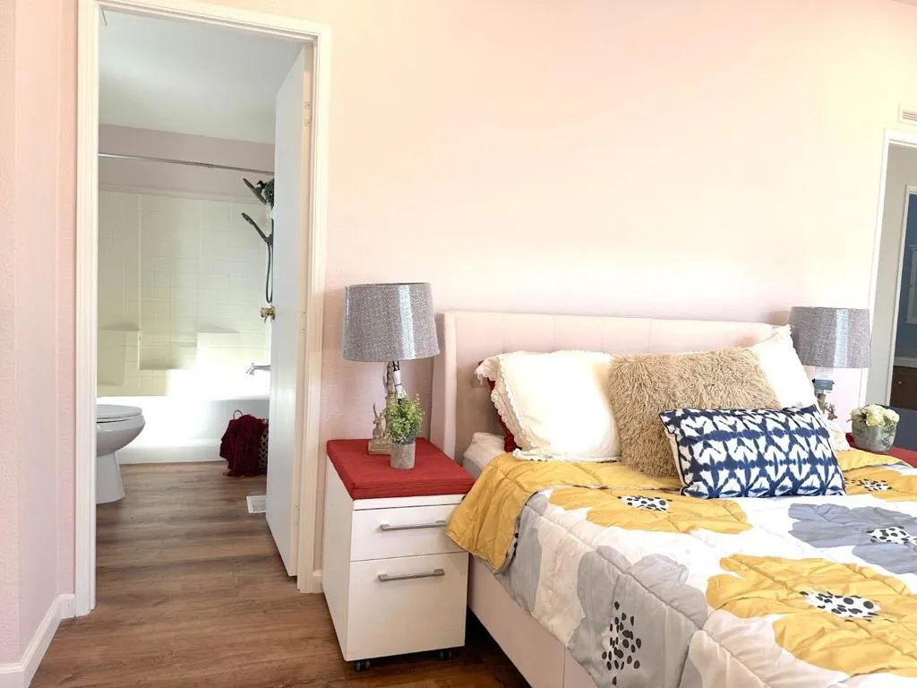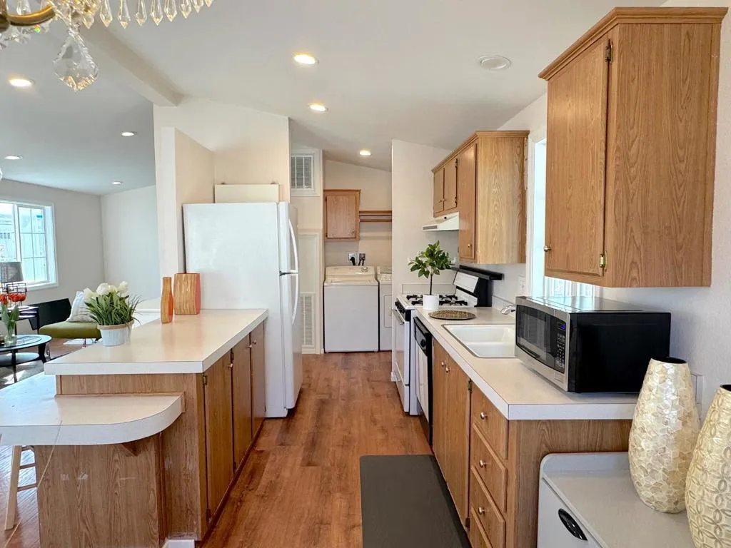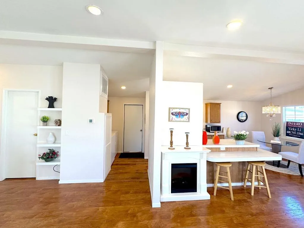 Welcome to this spacious 2-bedroom, 2-bath home in the desirable all-age community of Sun Valley Mobile. This home features a freshly painted interior and exterior, newly installed energy-efficient dual-pane windows, and recessed lighting throughout. Recent upgrades include new plumbing, a water heater, flooring, HVAC system, shingle roofing, an extended carport awning, porch decking, gutters, and siding. The bright living room boasts a vaulted ceiling, enhancing the open feel. Both bedrooms offer ample closet space and their own bathrooms. Outdoor space offers extra outdoor space ideal for BBQs or entertaining, plus a storage shed. Conveniently located near Costco, Lucky, the downtown farmers market, and with easy access to HWY 84 and I-580. Premium Outlets are just 10 minutes away, and top-rated schools are nearby. A community shuttle at the gate provides direct access to the BART station. Don't let this opportunity slip away, make it yours today!