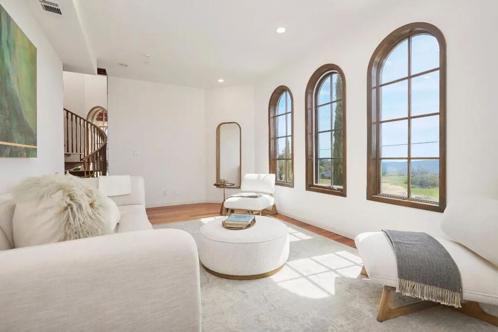 Beautiful inside-outside living on a top of the hill! Gorgeous custom home, castle inspired, on 2 acres of well-maintained grounds in 10-minute drive from downtown Saratoga. One of the most scenic roads in California, with views getting better when getting higher. Tennis court, mature Vineyard and vegetable garden; built-in grill; pizza-oven; water well-"free water". Magic of ancient olive trees and the Bay Laurel tree forest, mature Kwanzan Sakura and Red Dragon Japanese maple. Two story 2007 built 4 bdr 2.5 bath 2918 sq ft house with attached oversized 2 car garage features hardwood floors all around and artistic details. On the ground floor there are chefs kitchen, spacious dining room with adjacent wine room; office/bedroom, living room with a wood burning fireplace and exits to the backyard; a 1/2 bathroom. Elegant stairway leads to the second floor. There are the large family room/library; a master suite, two additional bedrooms; full bathroom and a laundry room. Relax in a hot tub on a roof top terrace. Plenty of parking space in the driveway. Enjoy views of the hills and canyons, of San Francisco and Monterey Bay Peninsula, the hiking trails of El Sereno Open Space Preserve and Sanborn Park. Excellent Saratoga schools. Must see in person to truly appreciate the beauty!