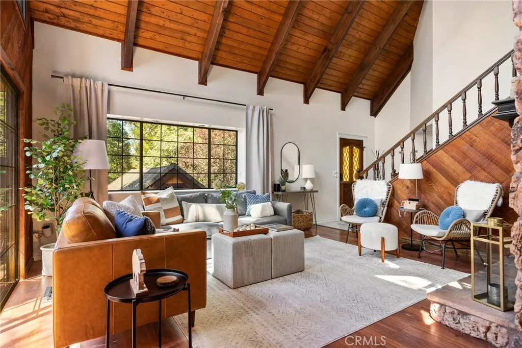 Welcome to your mountain cabin, full of natural light and vaulted ceilings that give the wow factor. This 3 bedroom home boasts entertainment. Once you arrive you will note the full mature landscaping, including Lilacs, Purple Plums, Laurels, Pines and more, adding ample privacy. The driveway and garage are just about level adding ease to your parking and access from the street. Inside the home you will find tall vaulted ceilings with unique angled woodwork, and lots of windows adding to the charm and architecture. There is 2 bedrooms on the main floor and a full bath, laundry area, kitchen and 2 attached decks one large one at the front door and one out back with spa. Upstairs is the loft space with attached deck, along with large primary suite. On the bottom floor you will find the family room and access to the garage. Above the garage is a secret little room that can be used for storage, an office, or whatever your heart desires. Property comes fully furnished, minus sellers personals, and has been/is a successful Airbnb. Home is located near the middle school, and not far from the off road trails, pinnacles hiking trail and national forest. Located in Lake Rights and on a county maintained road. Don't pass this one up.