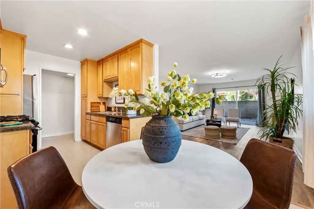 Gorgeous two-bedroom ground floor unit featuring a spacious living room highlighted by a cozy fireplace and direct access to an expansive rear patio ideal for indoor-outdoor living. The beautifully updated kitchen offers warm maple cabinetry , stylish countertops, stainless steel appliances. Large primary bedroom has double closet space , dressing area and a view of your private rear patio. Second bedroom is bright & open with lots of closet space Both bathrooms have been tastefully updated . This beautiful condo feels like a home with other features including smooth ceilings, designer lighting, all dual pane windows and sliding door, freshly painted & updated flooring . Villa Warner is a gated community which offers a large pool, spa , gym, billiards room, clubhouse outdoor BBQ's pet friendly. Conveniently close to the beach, shopping, dining and easy access to all fwys