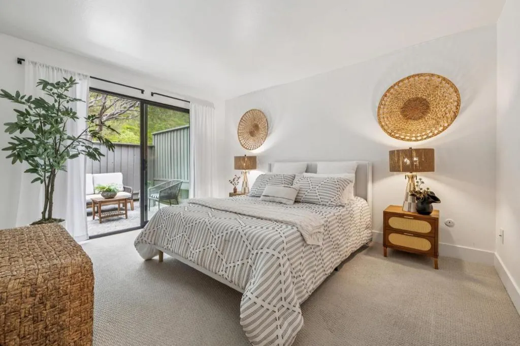 This 2-story PUD townhome (per prelim) has a layout that truly works. On the first floor, you'll find a bedroom with direct access to a private patio, plus a full bath nearby. Perfect for guests, extended family, or a private home office setup. The living room is warm and inviting, centered around a wood-burning fireplace and opening to a deck overlooking the San Rafael hills. Plantation shutters add style and privacy, while owned solar panels help with efficiency. Upstairs features two additional bedrooms, a bathroom, and a spacious bonus room that can easily serve as a fourth bedroom, media room, or work-from-home headquarters. The primary bedroom includes a walk-in closet for extra storage. In-unit washer and dryer, additional storage space, an attached carport, and plenty of street parking make everyday living easy. The HOA includes a community pool and clubhouse. Located just minutes from trails, biking paths, the Farmers Market, shopping, Dominican University, and China Camp State Park. This is Marin living done right.