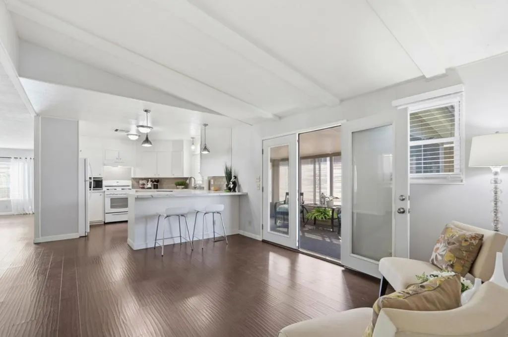 Move right in to this updated home in the highly desirable 55+ age-restricted Mountain Springs mobile home community. Be delighted with the luxurious gardens as you approach the front of this home. Open the front door to an expansive living room featuring newer laminate flooring, double pane windows throughout, and calming light grey paint. Meander through the living room to the dining area with tasteful lighting to entertain your guests. Next behold the bright white kitchen featuring a breakfast bar area where you can also enjoy meals. The kitchen looks out to the cozy family room and the 8'x15' bonus sunroom waiting for you to relax and spend quiet moments. The home also features two bedrooms each with their own bath. The primary bedroom features a walk-in closet, and ensuite bath with a garden tub and separate shower. Mountain Springs is situated close to the light rail station, Home Depot, grocery stores, banks, and many restaurants. You will love living here. The home has low space rent of $1025/month.