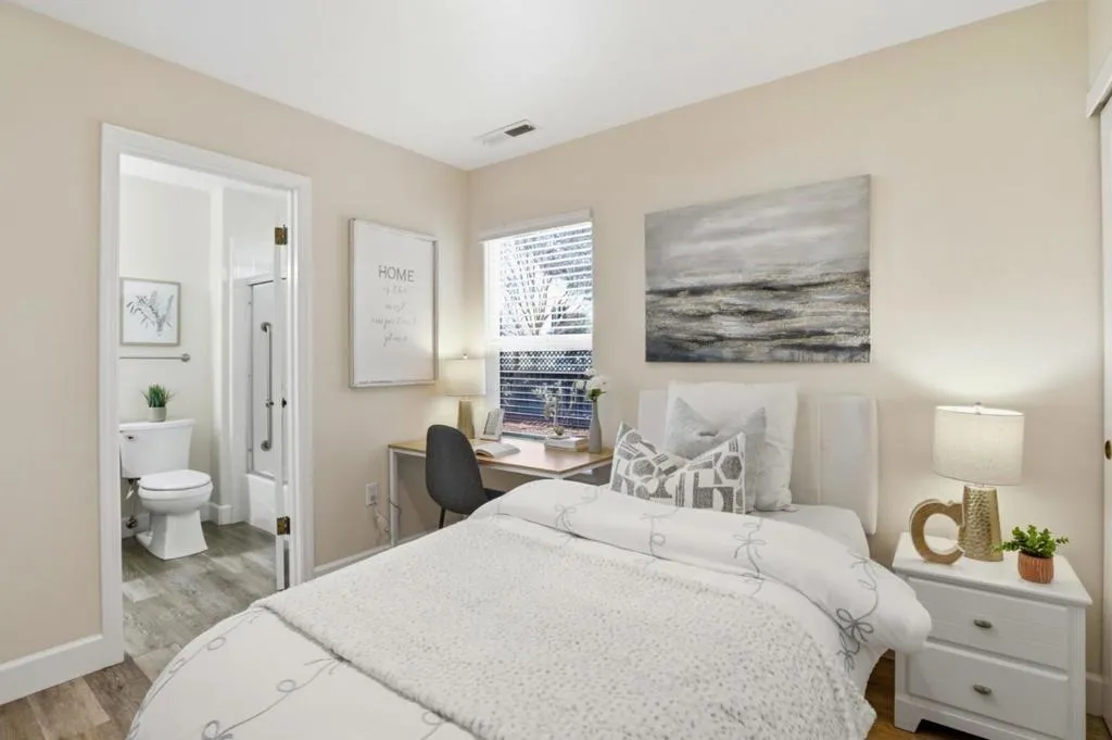 Welcome to this charming 3-bedroom, 2-bathroom home, offering 1,300 sq ft of thoughtfully designed living space. Step inside to a bright, airy interior featuring vaulted ceilings, double-pane windows, and beautiful laminate flooring throughout, creating a modern inviting atmosphere. The living room is centered around a cozy gas fireplace, perfect for relaxing evenings or gatherings with friends and family. The well-appointed kitchen blends convenience and functionality, featuring custom cabinetry, an electric range, dishwasher, microwave, and garbage disposal. The spacious primary suite includes a walk-in closet and access to the backyard. There is a dedicated utility room with washer and dryer. Enjoy a private front courtyard, ideal for morning coffee or quiet moments, along with a beautifully landscaped backyard offering space for entertaining, gardening, or simply unwinding. Additional highlights include central air conditioning and heating for year-round comfort. Located within the Oak Grove Elementary School District, this home offers convenient access to nearby schools, parks, shopping, dining, and major commute routes. Blending comfort, functionality, and welcoming indoor-outdoor living, this delightful home is a wonderful place to call home in San Jose.