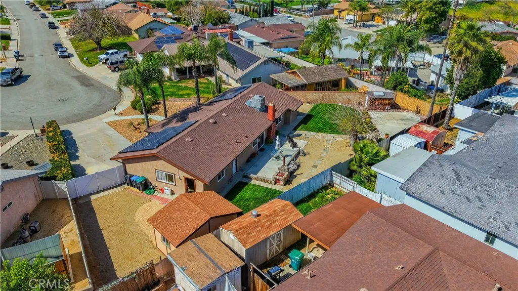 This Menifee single-story home is sure to please! If you’ve been searching for a property with no HOA, low taxes, RV parking, a huge lot, paid solar, and move-in ready condition, this may be the one. There are so many perks here—where do I start? As you drive up the quiet cul-de-sac, you’ll immediately notice the low-maintenance front yard, the extra-long driveway with room for four cars, and the easy-access double vinyl gate leading to the massive RV parking area. And those solar panels on the roof? All 28 of them are fully paid for. Step inside and you’ll find the home just as welcoming as the exterior. Neutral porcelain tile runs through the entry, halls, kitchen, and dining area, complemented by upgraded baseboards. The remodeled kitchen features beautiful quartzite countertops, soft-close Yorktowne cabinetry, a newer Kohler sink, and GE appliances. The kitchen opens to a spacious dining area with a cozy fireplace and sliding glass door leading to the backyard. The living room offers plenty of space to relax and enjoy sunset views from the front window. Down the hall are two guest bedrooms, both with ceiling fans, with one featuring wood-look tile flooring. The guest bathroom has been updated with newer paint and a marble bath/shower surround. The primary suite is generously sized and includes a ceiling fan, large vanity area with sit-down space, and a beautifully remodeled marble shower. The garage is extra deep and features a built-in workbench and workstation, along with a laundry area and convenient drop-down attic access for additional storage. Need even more space? Behind the impressive 15’ x 45’ RV parking area you’ll find a large storage shed or “she shed” complete with lighting. The backyard is incredibly spacious and offers endless possibilities — there’s still plenty of room to add a pool, spa, or even an ADU. The yard features a patio, BBQ area, gardening shed, lawn space, and a large concrete pad that could accommodate an above-ground pool, spa, or even a basketball court. Additional upgrades include a newer roof, dual-pane windows, fresh exterior paint, rain gutters, and a newer 3-ton HVAC system. Conveniently located near the 215 freeway, the hospital, grocery stores, restaurants, and a large park just down the street. Plus, you’re within about a 30-minute drive to Diamond Valley Lake, Temecula Wine Country, Lake Perris, and Lake Elsinore, making it easy to enjoy everything Southwest Riverside County has to offer.