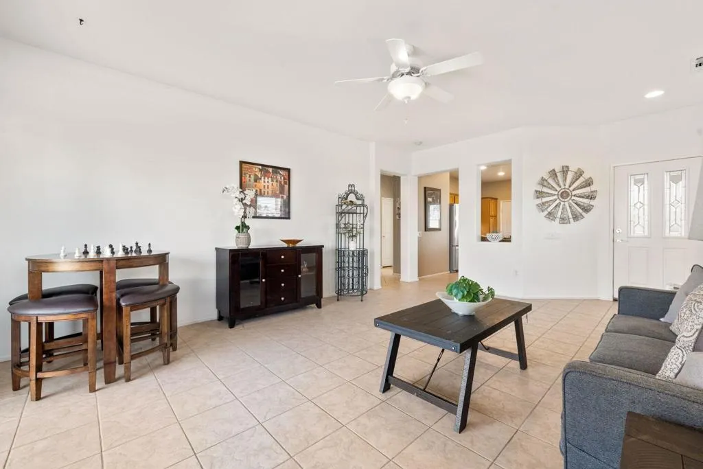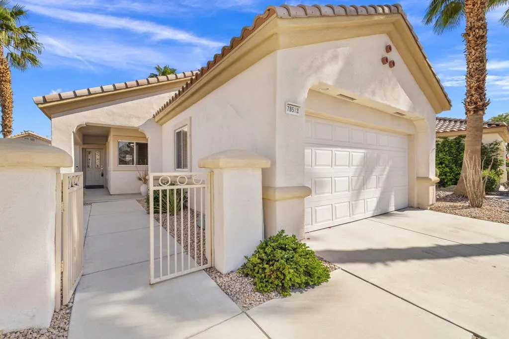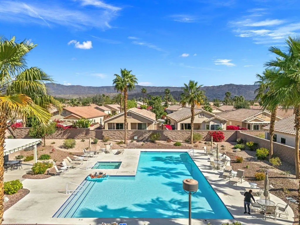 Can you imagine living just steps to a fabulous saltwater pool kept at around 87 degrees, and a spa kept at the perfect soaking temperature? Well, here it is. All the pleasure of your very own pool/spa, and no headaches. This home is perfect as a full-time, or lock-and-go property. The location is super convenient, being close to the Varner gate. It has 2 bedrooms, 2 baths, and a 2-car garage. The HVAC is newer and the home is immaculate. The kitchen includes all appliances, and a kitchenette nook for dining. The master has a bay window viewing the large, manicured backyard. The bathroom has a luxurious walk-in soaking tub, a walk-in closet, and a double-sink vanity. The guest bedroom/office has a convenient Murphy bed and is adjacent to the 2nd full bath. The living room is large and has a slider out to the inviting southwest facing backyard with a peek-a-boo mountain view. It has easily maintained turf, desert landscaping, and a covered patio for shade and comfort. The BBQ stays with the home. And now the best part...It is just a few steps to a semi-private pool and spa area. This amenity has BBQ's, bathrooms, and showers for a small monthly HOA fee. It's great for entertaining your family and friends. Bring your floatie, a book, and your favorite beverage, and relax in the warm therapeutic water. SUN CITY PALM DESERT IS A 55+ DEL WEBB COMMUNITY, ALL ABOUT A GREAT LIFESTYLE!! It has many clubs, activities, amenities, wonderful people, and low HOA dues. Play at 2 championship 18-hole golf courses and practice facilities, pickle ball, tennis, softball, bocci ball, an 18-hole miniature golf course, an honor library, arts and crafts, a ballroom for special entertainment, and 4 saltwater pools kept at 87 degrees with hot tubs. Enjoy 2 great restaurants, a martini/coffee bar, and even a post office. There is a newly renovated, classy indoor/outdoor bar with fire tables to enjoy the awesome views and our beautiful desert weather.