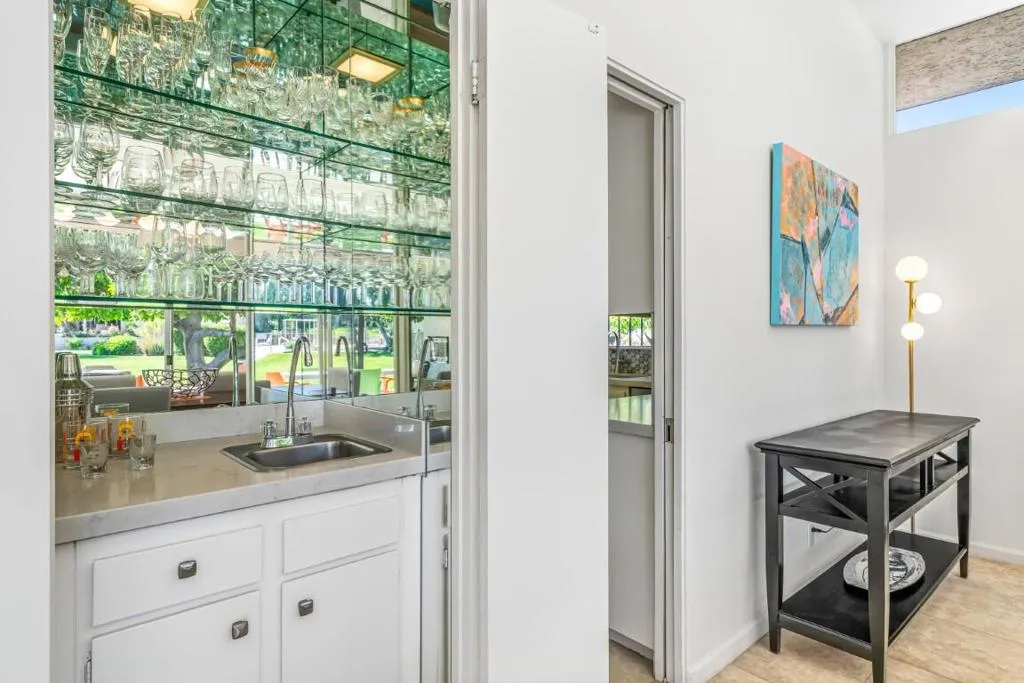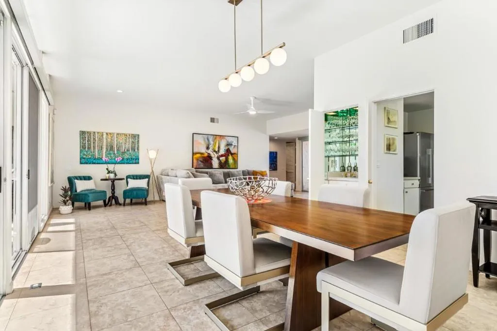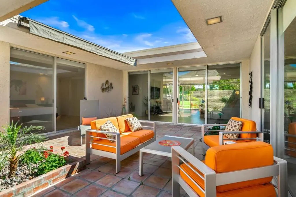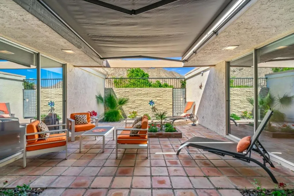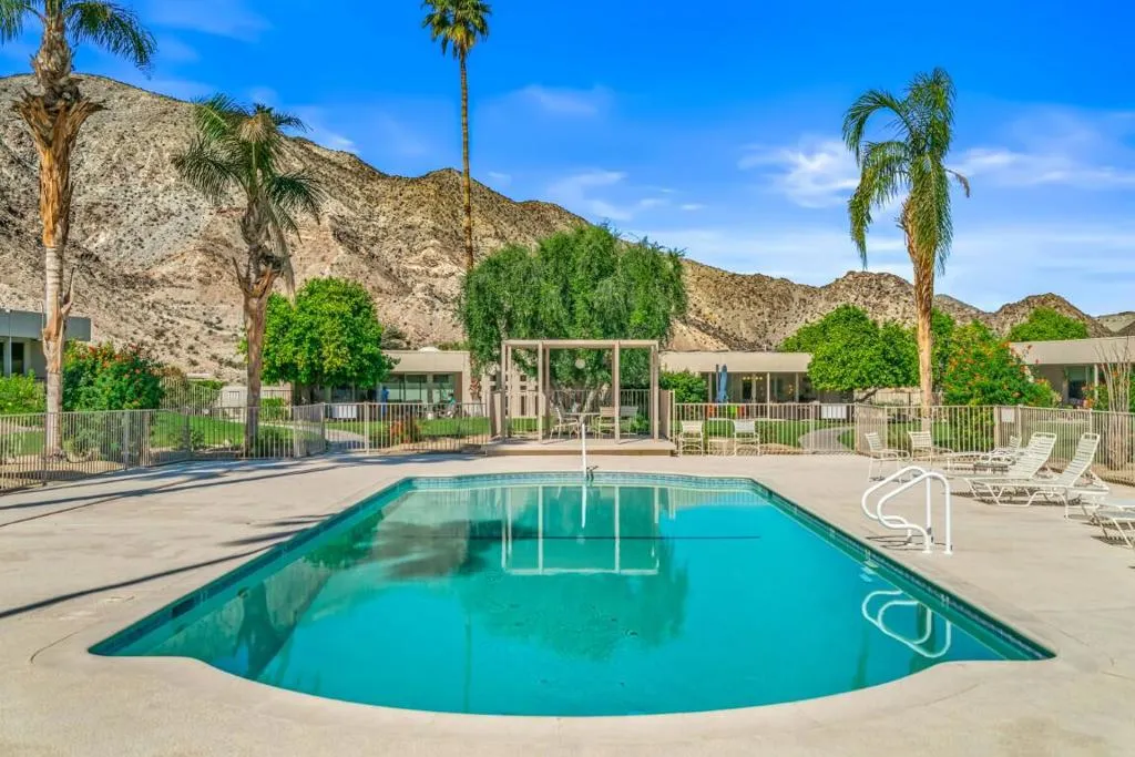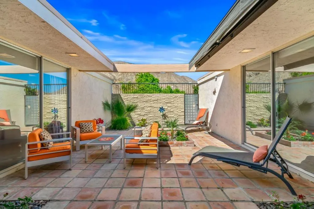 This spacious 3-bedroom, 3-bath condo is located in Sandpiper community's exclusive Circle 17, featuring only 10 residences surrounding the pool. The open floor plan seamlessly combines the living and dining areas, opening directly to a poolside patio for effortless indoor-outdoor living.The unit features tile flooring throughout, an in-unit laundry room, and three generously sized bedrooms. Two bedrooms are primary en suites, while the third offers easy access to a beautifully updated bath. Each bedroom includes sliding doors that enhance natural light and connect to outdoor spaces. The primary suite is highlighted by a soaking tub and separate walk-in shower.The kitchen blends vintage design with premium finishes, including quartz countertops and high-end appliances: a Fisher & Paykel refrigerator, Viking cooktop and oven, Viking microwave/convection oven, and Bosch dishwasher. High ceilings, clerestory windows, and expansive walls of glass define the living and dining areas, creating a bright, airy atmosphere that honors the home's original architectural character while incorporating contemporary upgrades.The unit includes an owned 20-panel solar system with LG battery backup, providing energy efficiency and peace of mind. Outdoor living is enhanced by two exceptional spaces: a private, mountain-facing courtyard ideal for quiet mornings, and an east-facing poolside patio perfect for entertaining, surrounded by lush landscaping with direct access to the community pool.Two garage parking spaces with additional storage are conveniently located just steps away. Ideally positioned within walking distance to El Paseo's renowned dining and shopping, the museum, hiking trails, and grocery stores, this residence offers the perfect blend of comfort, convenience, and timeless desert living.