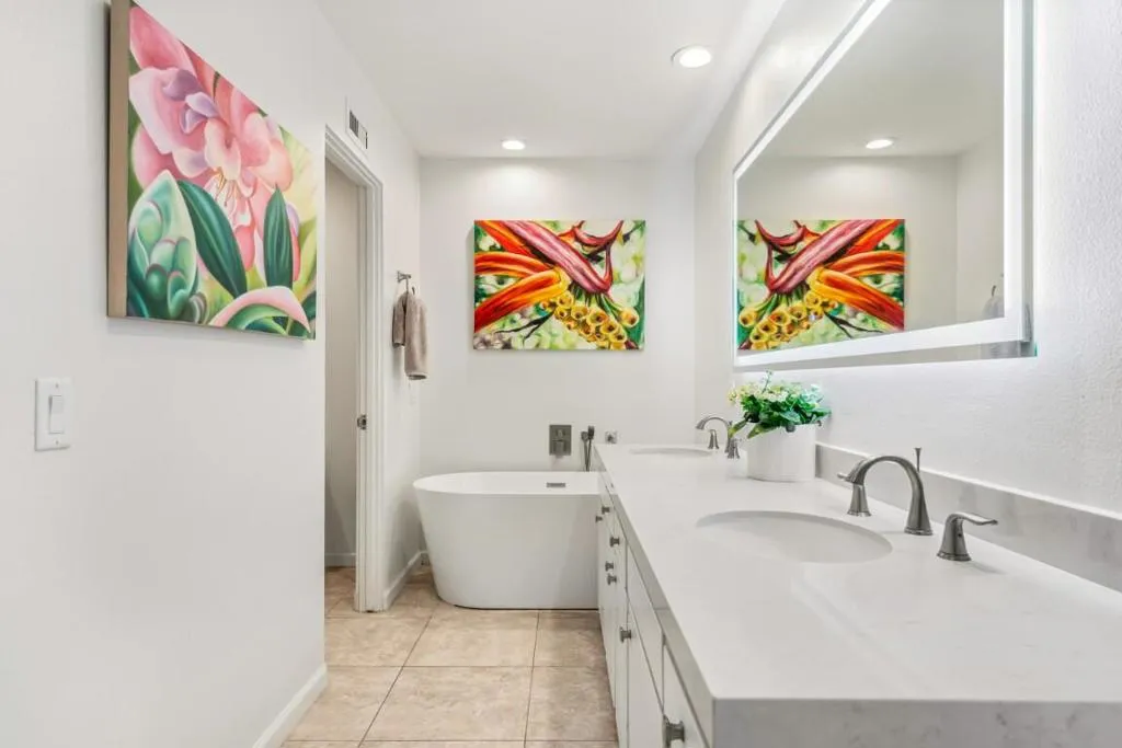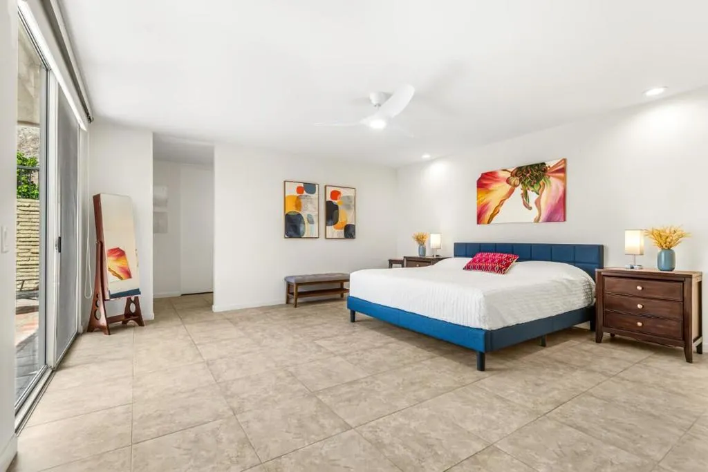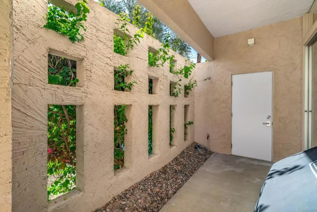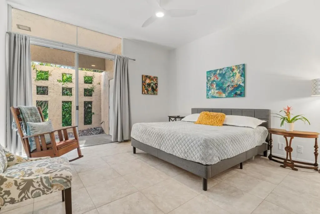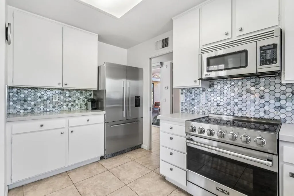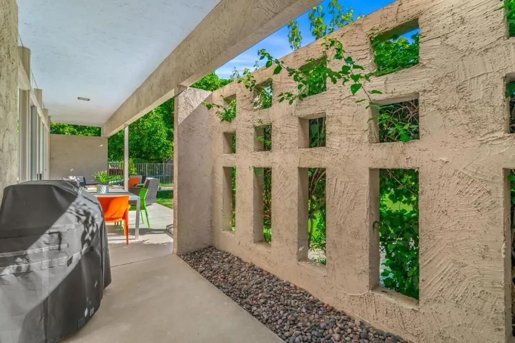 This spacious 3-bedroom, 3-bath condo is located in Sandpiper community's exclusive Circle 17, featuring only 10 residences surrounding the pool. The open floor plan seamlessly combines the living and dining areas, opening directly to a poolside patio for effortless indoor-outdoor living.The unit features tile flooring throughout, an in-unit laundry room, and three generously sized bedrooms. Two bedrooms are primary en suites, while the third offers easy access to a beautifully updated bath. Each bedroom includes sliding doors that enhance natural light and connect to outdoor spaces. The primary suite is highlighted by a soaking tub and separate walk-in shower.The kitchen blends vintage design with premium finishes, including quartz countertops and high-end appliances: a Fisher & Paykel refrigerator, Viking cooktop and oven, Viking microwave/convection oven, and Bosch dishwasher. High ceilings, clerestory windows, and expansive walls of glass define the living and dining areas, creating a bright, airy atmosphere that honors the home's original architectural character while incorporating contemporary upgrades.The unit includes an owned 20-panel solar system with LG battery backup, providing energy efficiency and peace of mind. Outdoor living is enhanced by two exceptional spaces: a private, mountain-facing courtyard ideal for quiet mornings, and an east-facing poolside patio perfect for entertaining, surrounded by lush landscaping with direct access to the community pool.Two garage parking spaces with additional storage are conveniently located just steps away. Ideally positioned within walking distance to El Paseo's renowned dining and shopping, the museum, hiking trails, and grocery stores, this residence offers the perfect blend of comfort, convenience, and timeless desert living.