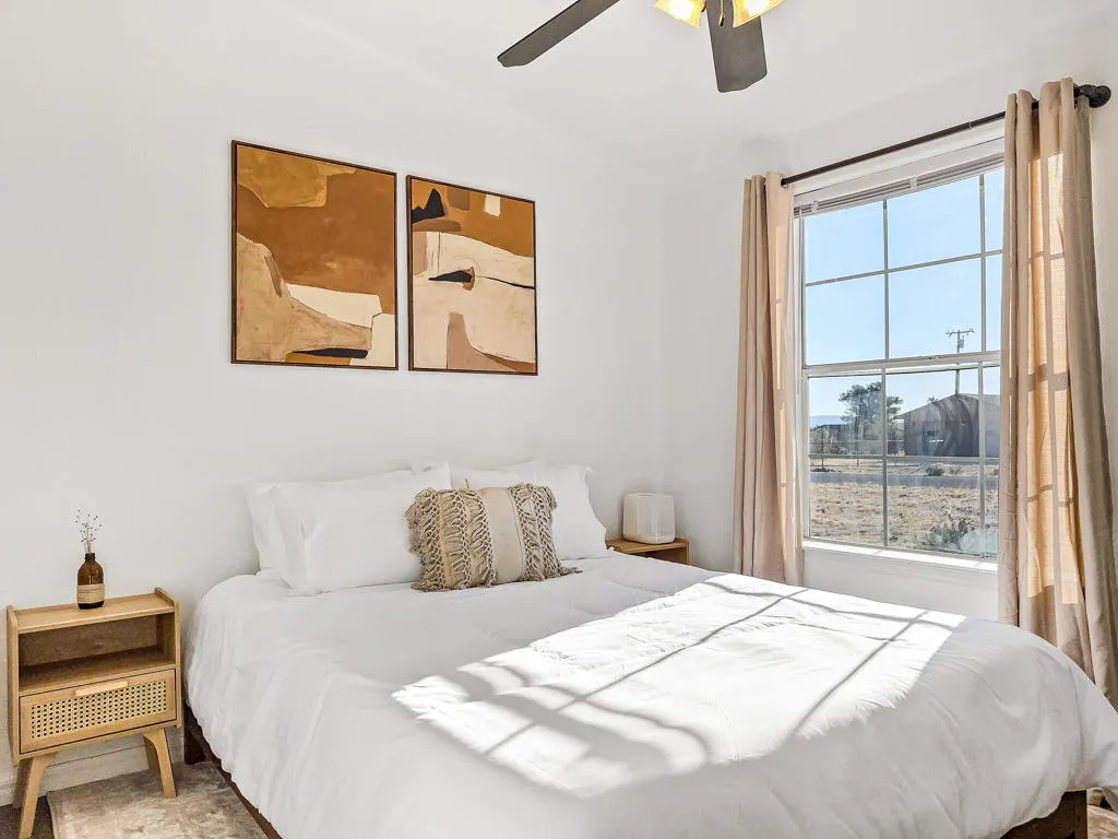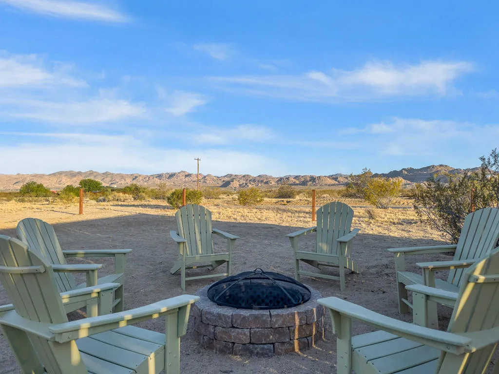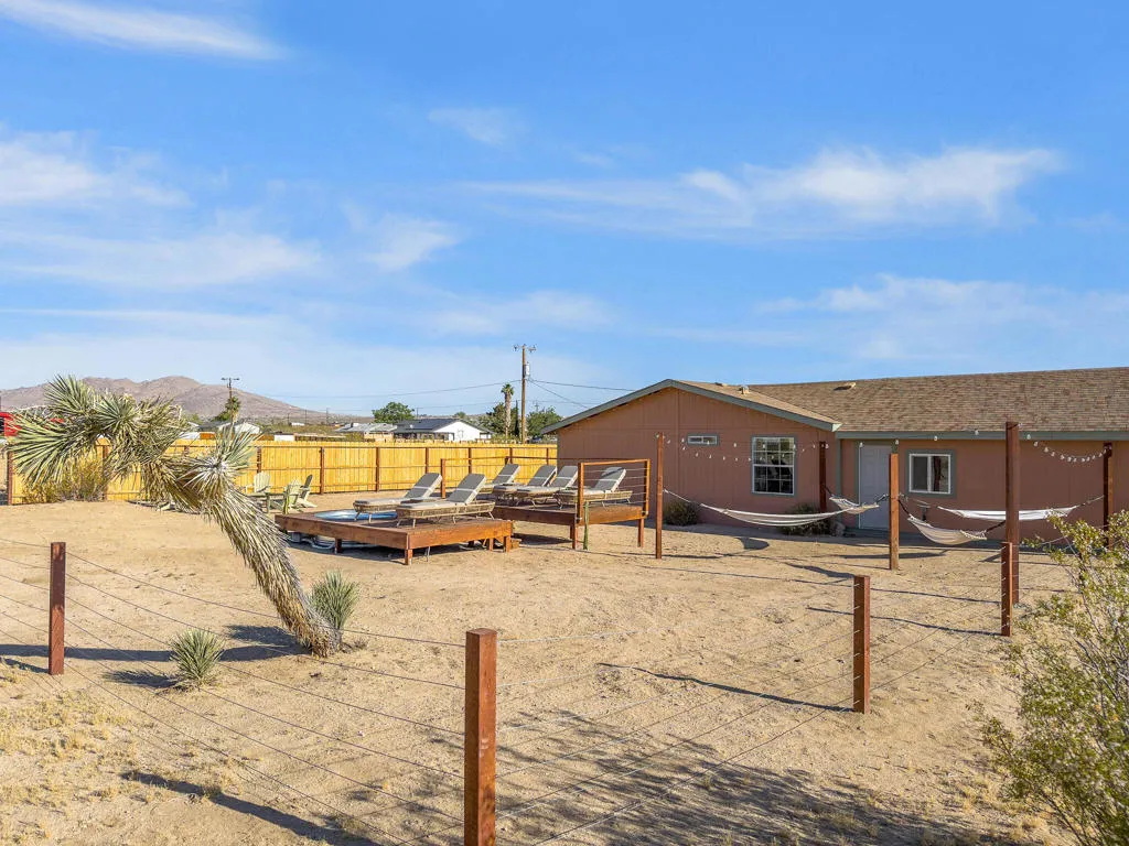 Joshua Tree 3-bedroom desert retreat in the Sunfair area just minutes from Joshua Tree National Park, offering expansive views, outdoor living, and unforgettable stargazing nights. Welcome to Leaning Joshua, a spacious high-desert retreat set beneath the wide open skies of one of Joshua Tree's most desirable neighborhoods. Inside, the home features an inviting open living area, a dining space ideal for gathering, and a fully equipped kitchen with modern appliances. Three comfortable bedrooms provide flexible accommodations for family, guests, or potential rental use. Step outside to experience the beauty of the surrounding desert landscape. The backyard is designed for outdoor living with a shaded seating area, chimenea, fire pit, BBQ grill, and multiple lounge spaces ideal for enjoying breathtaking sunsets and peaceful desert evenings. A custom deck with lounge chairs offers the perfect place to relax in the sun, while the cowboy tub provides a refreshing way to cool off while taking in the vast desert sky. Thoughtfully oriented for stargazing, the deck offers a front-row seat to Joshua Tree's remarkable night skies, including stunning views of the Milky Way and the moon rising along the eastern horizon as it travels across the desert sky. Surrounded by open desert landscape and minimal light pollution, the property offers exceptional privacy and some of the most spectacular stargazing skies the high desert is known for. Conveniently located near Joshua Tree Village, local shops, dining, and the entrance to Joshua Tree National Park, this property presents an excellent opportunity as a full-time residence, weekend getaway, or investment property in one of the high desert's most sought-after destinations.