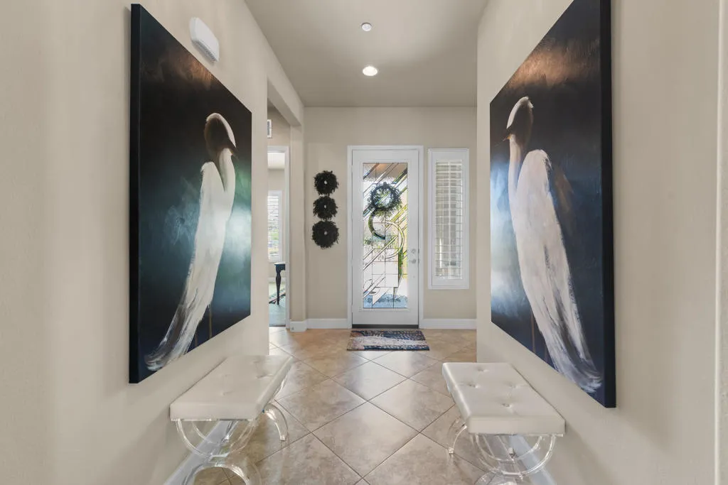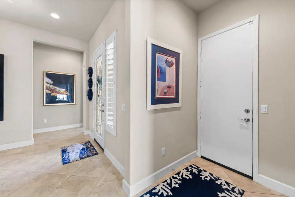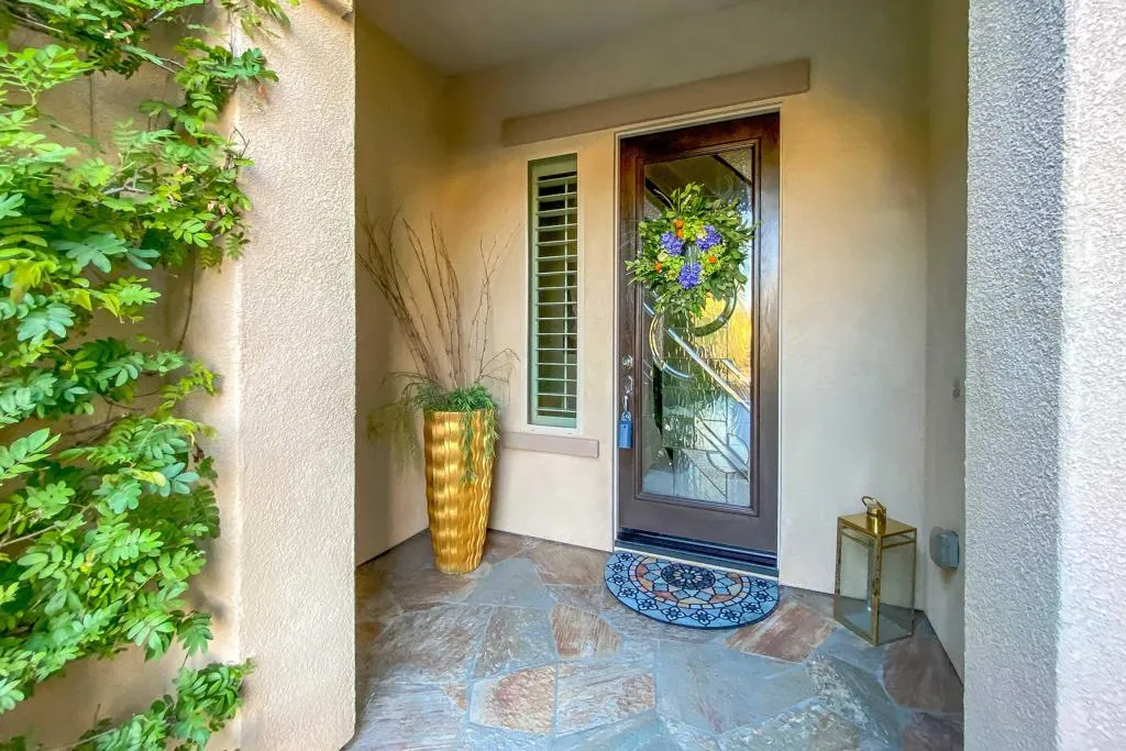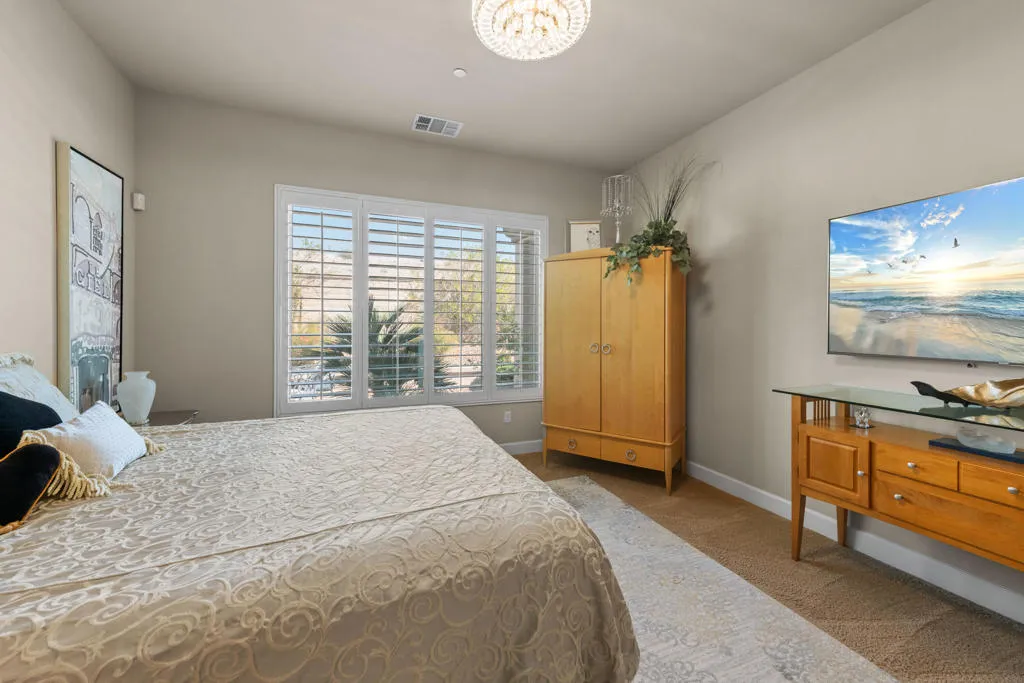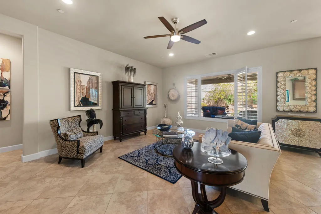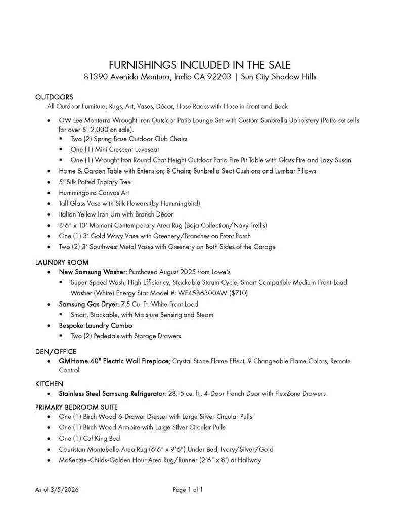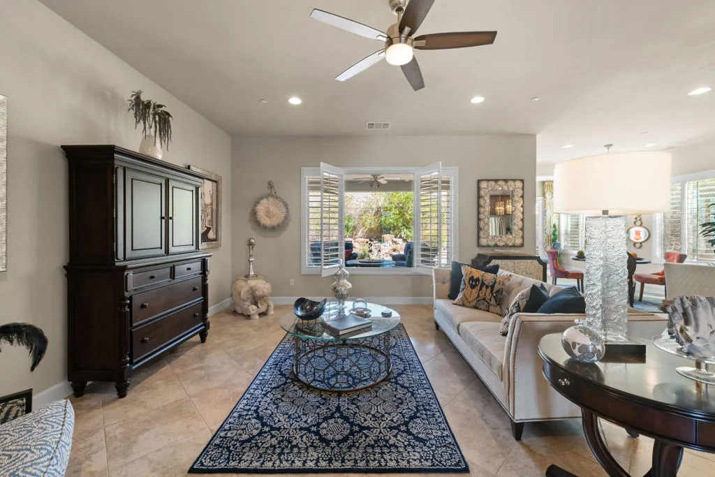 Experience elevated desert living in this highly upgraded, energy-efficient Retreat model with SUNROOM EXTENSION, POWDER ROOM, and GOLF CART GARAGE in Del Webb's premier 55+ resort community of Sun City Shadow Hills. Ideally located in the newest section of Phase 3 near the Santa Rosa clubhouse, the home has no rear neighbors, offering exceptional privacy, open sky views, breathtaking desert stargazing, and continuous bird watching. Enjoy your morning coffee relaxing on the comfortable OW Lee designer patio furniture included in the sale of the property and sip your evening wine gathered around the glass firepit with family and friends. This cozy veranda offers outdoor desert living at its finest. In the summer months, duck into the cool indoors to enjoy the new upgraded HVAC system with precise temperature control and quiet operation. The new TRANE XV18 variable-speed heat pump (2025) will provide peace of mind year-round generating very low energy costs (Summer IID Average: $227 2025 versus $445 2024). The interior showcases Italian porcelain tile set on the diagonal, PLANTATION SHUTTERS, 10-foot-high ceilings, upgraded lighting, and designer sun shades. The gourmet kitchen shines with granite slab countertops, stainless appliances, and custom open shelving. Both bedrooms feature luxurious en-suite baths and CUSTOM CLOSET ORGANIZERS by California Closets, while the Den features an in-wall FIREPLACE and custom built-in cabinetry, perfect for use as a home office. Installed in 2026, the following system upgrades include: garbage disposal; invisible rain gutters; garage door opener; freshly painted side gate/rear wall, and a newer water heater (2024). The insulated garage offers a true Trane A/C and heat, epoxy flooring, built-in cabinetry, and golf cart space. Outside, enjoy low-maintenance desert landscape enhanced with low voltage lighting, an expanded covered patio w/upgraded drainage system, all in a serene private setting ideal for relaxing or entertaining. PARTIALLY FURNISHED and move-in ready, this beautifully maintained home is the perfect blend of comfort, style, and easy desert living. Residents of Sun City Shadow Hills enjoy resort-style amenities including golf, pools, fitness, pickleball, and more--just minutes from Palm Springs dining, shopping, and entertainment.