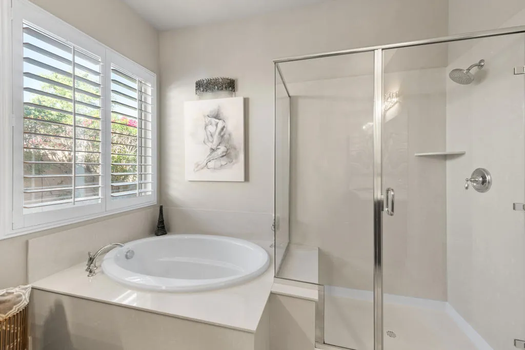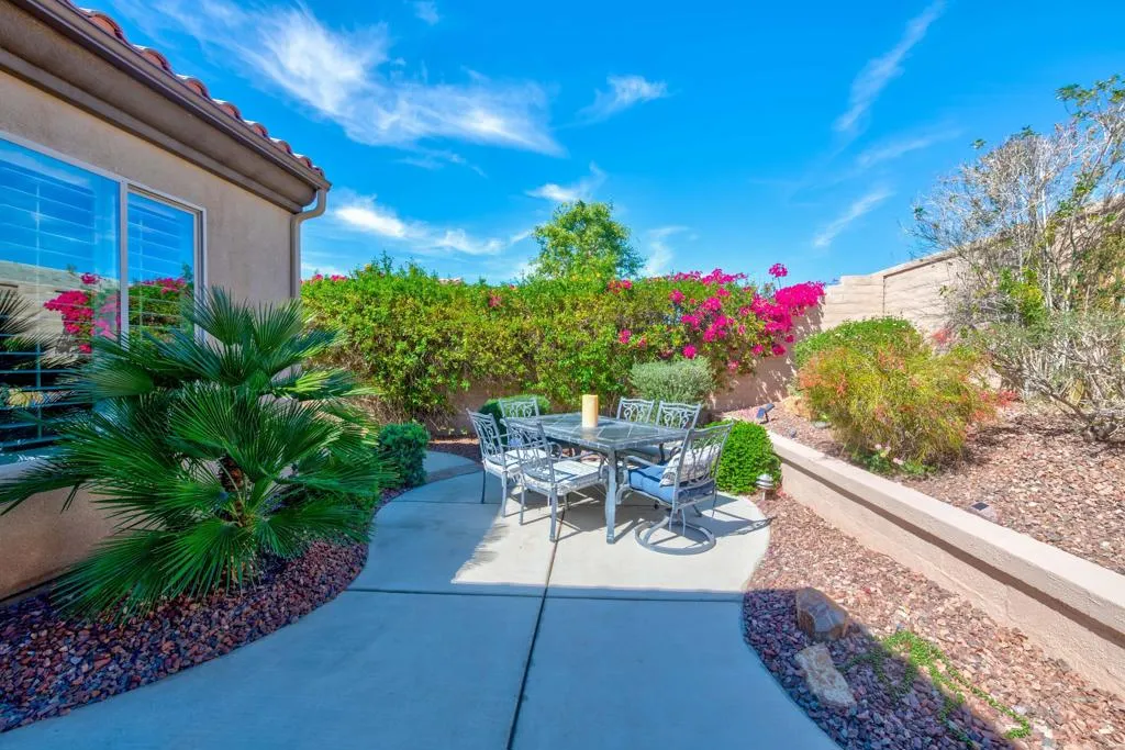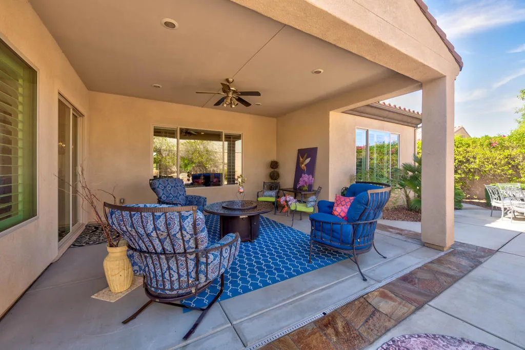 Experience elevated desert living in this highly upgraded, energy-efficient Retreat model with SUNROOM EXTENSION, POWDER ROOM, and GOLF CART GARAGE in Del Webb's premier 55+ resort community of Sun City Shadow Hills. Offered PARTIALLY FURNISHED per inventory, this move-in ready home is ideally located in the newest section of Phase 3 near the Santa Rosa clubhouse, and with no rear neighbors it offers exceptional privacy, open sky views, breathtaking desert stargazing, and continuous bird watching. Enjoy your morning coffee relaxing on the comfortable OW Lee designer patio furniture included in the sale of the property and sip your evening wine gathered around the glass firepit with family and friends. This cozy veranda offers outdoor desert living at its finest. In the summer months, duck into the cool indoors to enjoy the new upgraded HVAC system with precise temperature control and quiet operation. The new TRANE XV18 variable-speed heat pump (2025) will provide peace of mind year-round generating very low energy costs (Summer IID Average: $227 2025 versus $445 2024). The interior showcases Italian porcelain tile set on the diagonal, PLANTATION SHUTTERS, 10-foot-high ceilings, upgraded lighting, and designer sun shades. The gourmet kitchen shines with granite slab countertops, stainless appliances, and custom open shelving. Both bedrooms feature luxurious en-suite baths and CUSTOM CLOSET ORGANIZERS by California Closets, while the Den features an in-wall FIREPLACE and custom built-in cabinetry, perfect for use as a home office. Installed in 2026, the following system upgrades include: garbage disposal; invisible rain gutters; garage door opener; freshly painted side gate/rear wall, and a newer water heater (2024). The insulated garage offers a true Trane A/C and heat, epoxy flooring, built-in cabinetry, and golf cart space. Outside, enjoy low-maintenance desert landscape enhanced with low voltage lighting, an expanded covered patio w/upgraded drainage system, all in a serene private setting ideal for relaxing or entertaining. MOVE-IN READY, this beautifully maintained home is the perfect blend of comfort, style, and easy desert living. Residents of Sun City Shadow Hills enjoy resort-style amenities including golf, pools, fitness, pickleball, and more--just minutes from Palm Springs dining, shopping, and entertainment.