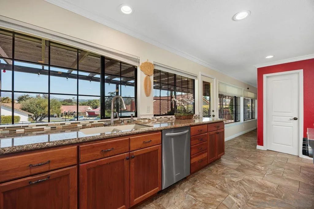 Upgraded single-level home in the highly sought-after Gaslight neighborhood of Rancho Bernardo. Situated on a premium corner lot backing to a tranquil greenbelt, this property offers beautiful mountain and hill views in an intimate community of only 22 homes. This spacious 2,216 square foot residence features 2 bedrooms, 2 bathrooms, plus a versatile office/den/optional bedroom or bonus room. The light-filled open kitchen is designed for both everyday living and entertaining, showcasing custom slow-close cabinetry, granite countertops, a large center island, walk-in pantry, recessed lighting, crown molding, and a 6-burner stainless steel KitchenAid gas cooktop with matching microwave, oven, and dishwasher. The expansive primary suite includes crown molding, a ceiling fan, and a sliding door to the patio. The fully remodeled primary bathroom offers dual sinks, granite countertops, upgraded cabinetry, and a stunning oversized walk-in shower with glass enclosure featuring steam and rain shower options. Additional upgrades include paid solar, dual-pane windows, newer furnace and A/C, upgraded water heater with recirculating pump, solar tube, recessed lighting, and a striking fireplace with Fire and Ice glass in the family room. Built-in cabinetry enhances the third bedroom or office space. The 2-car garage includes extra space ideal for a golf cart or workshop. Located within the award-winning Poway Unified School District and close to shopping, dining, and freeway access. Enjoy membership at Rancho Bernardo Swim & Tennis Club featuring pickleball, tennis, pools and more