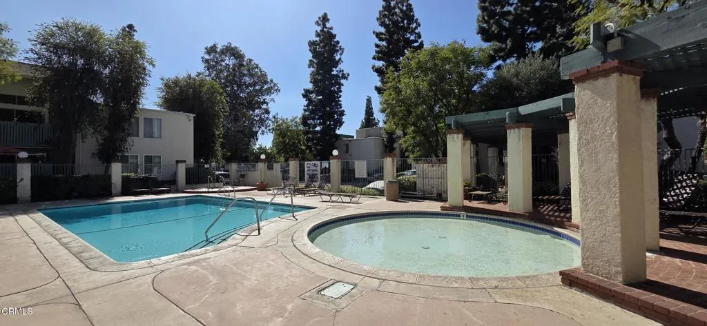 Welcome to this elegant and sophisticated single-story, ground-floor condominium featuring a thoughtfully designed floor plan and stylish updates throughout. Freshly painted interiors and beautiful wood-like flooring create a bright, inviting atmosphere from the moment you enter.The spacious living room offers plenty of room for relaxing or entertaining and opens to a cozy, private patio--perfect for enjoying morning coffee or evening breezes. The dining area is enhanced by dramatic floor-to-ceiling mirrors that reflect natural light and create an open, airy feel.The kitchen features quartz countertops, lovely cabinetry, and ample workspace for everyday cooking or hosting guests. Both the primary and secondary bathrooms have been fully updated with custom tile and stone finishes, adding a touch of luxury to the home.Bedrooms are generously sized and include mirrored closet doors and excellent storage space. A convenient hall linen closet adds additional organization.Located in a centrally situated gated community with a peaceful, park-like setting surrounded by mature, tall trees. Residents enjoy amenities including a swimming pool and convenient on-site laundry facilities. Unit features two assigned parking spaces one of which is covered.A wonderful opportunity to own a beautifully maintained home in a serene and well-located complex.