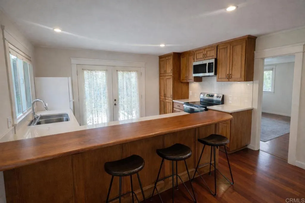 Charming duplex located in one of the most coveted coastal communities, the beloved Cardiff-by-the-Sea. This lovingly maintained home features 2 bedrooms, a sunroom, and 2 full bathrooms. Thoughtful craftsmanship is showcased throughout, with hardwood floors, custom cabinetry, and detailed wood casings handcrafted by the owner. The kitchen features a beautiful wood bar countertop that creates an open, inviting layout with additional seating. Natural light fills the home, highlighted by a centrally located skylight and numerous windows overlooking the property’s lush gardens. A convenient nook within the stairwell provides the perfect space for a home office or reading area. Enjoy seamless indoor-outdoor living with a private deck off the kitchen—ideal for al fresco dining, entertaining, or enjoying sunsets to the west. The surrounding greenery creates a peaceful setting and provides beautiful views from many rooms in the home.Additional features include covered parking with designated additional parking spaces, on-site storage, and shared laundry facilities. Residents also enjoy access to a swimming pool on the property. Ideally located within walking distance to Cardiff’s beaches, restaurants, cafés, and shops, this home offers exceptional convenience with easy freeway access. Utilities included!
