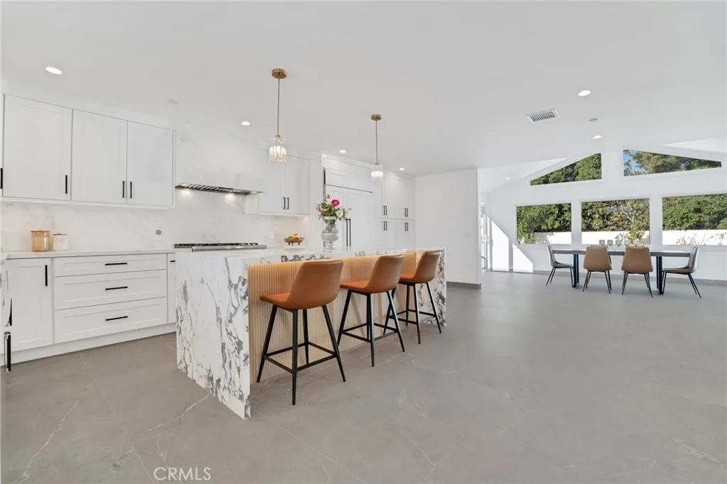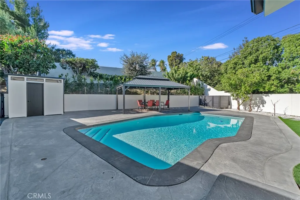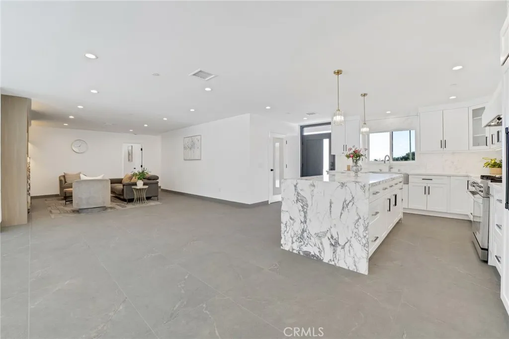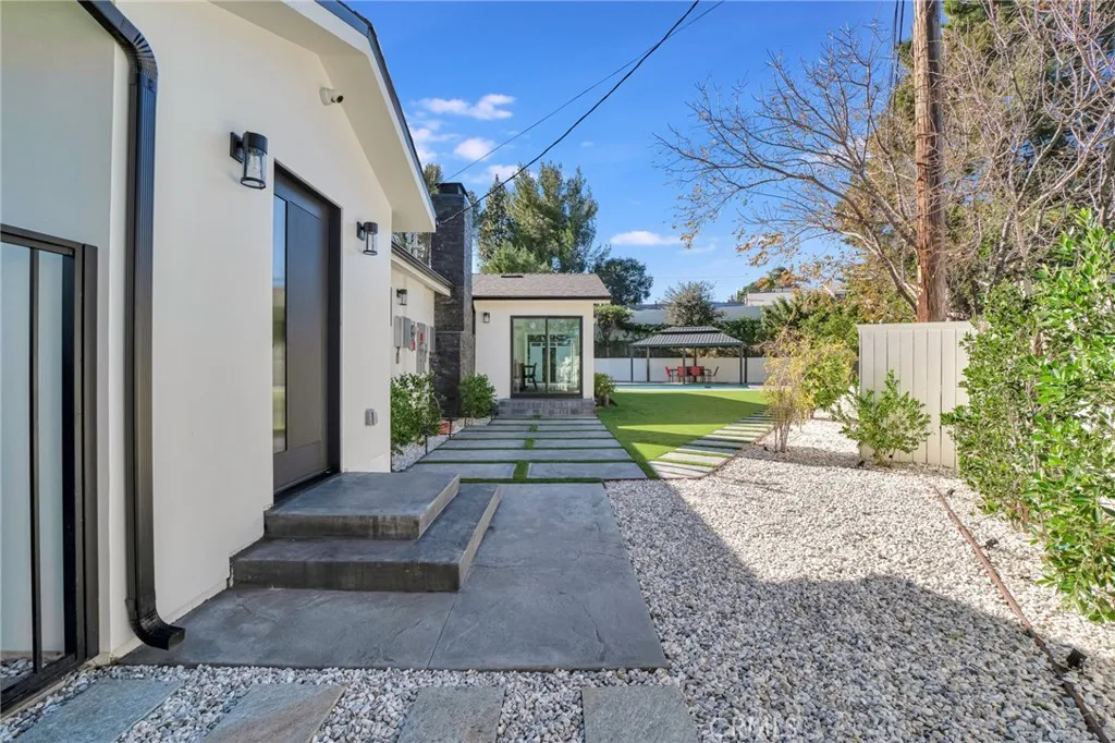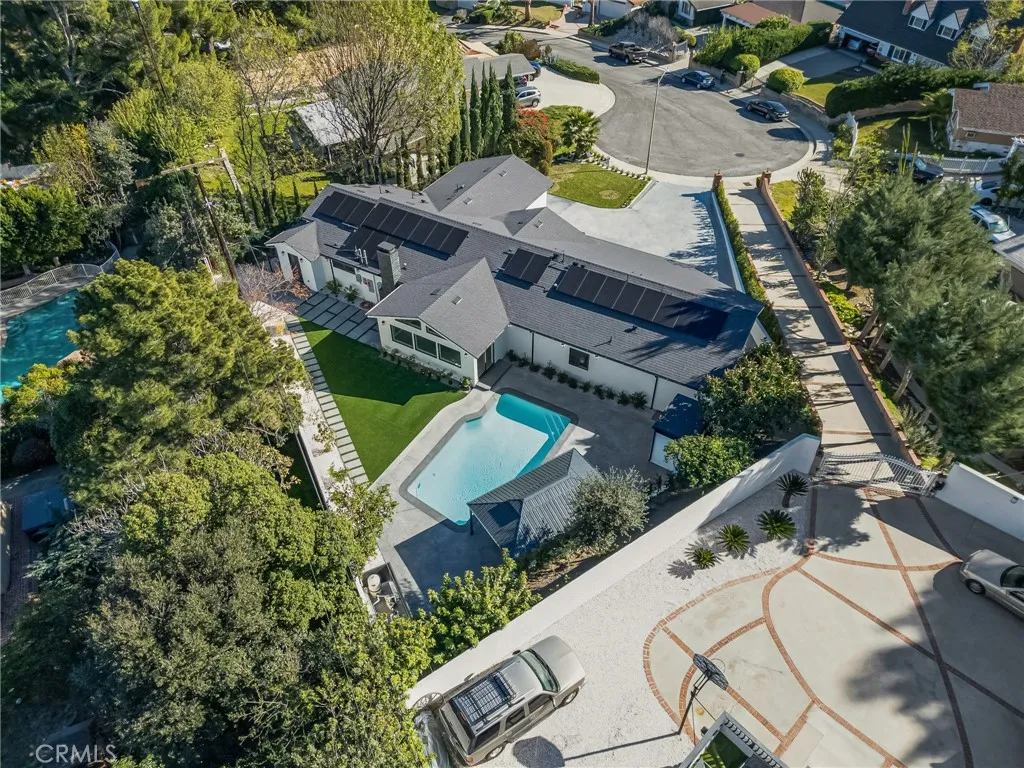 Stunning newly rebuilt modern compound with ADU, pool and Solar, located at 17165 & 17163 Midwood Drive in desirable Granada Hills, offering approximately 3,400 sq ft of combined living space with 6 bedrooms and 4 bathrooms, designed for luxury living, multi-generational flexibility, and income potential. Completely reconstructed with permits between 2025–2026 from foundation to roof, this exceptional property delivers the feel of new construction with brand-new major systems, energy efficiency, and high-end designer finishes throughout. The main residence (approx. 2,600 sq ft with 4 bedrooms and 3 bathrooms) features a highly desirable open floor plan with spacious living and dining areas filled with natural light. A dramatic Calacatta marble fireplace wall creates a striking centerpiece in the living area. The chef’s kitchen showcases a large Italian Calacatta marble island, matching marble countertops and backsplash, panel-ready Sub-Zero refrigerator, high-end appliances, custom cabinetry, and a walk-in pantry, making it ideal for both everyday living and entertaining. The primary suite retreat offers a sitting or office area, spacious walk-in closet, and a spa-inspired bathroom featuring a soaking tub and oversized walk-in shower finished in luxury porcelain. A dedicated laundry room with marble finishes, utility sink, smart LG washer and dryer, folding area, and storage cabinetry adds everyday convenience. The newly constructed ADU / Guest house (approx. 800 sq ft with 2 bedrooms and 1 bathroom) includes its own open living area, kitchen, and private laundry, ideal for rental income, guest quarters, or extended family living. The outdoor space features a fully upgraded swimming pool with Pebble finish and lighting, a convenient exterior pool bathroom, and low-maintenance landscaping with artificial turf. Exterior highlights include more than 10 varieties of fruit trees, a newly poured treated concrete driveway, RV parking, dedicated storage area, and stone-accented entry. Additional upgrades include new roof, insulation, plumbing, drainage, windows, gutters, two independent HVAC systems with smartphone control, two separate solar systems (one per residence), fire sprinklers, and separate gas and water meters. This rare Granada Hills compound with ADU, pool, solar, and income potential offers exceptional flexibility and modern living in a prime San Fernando Valley location.