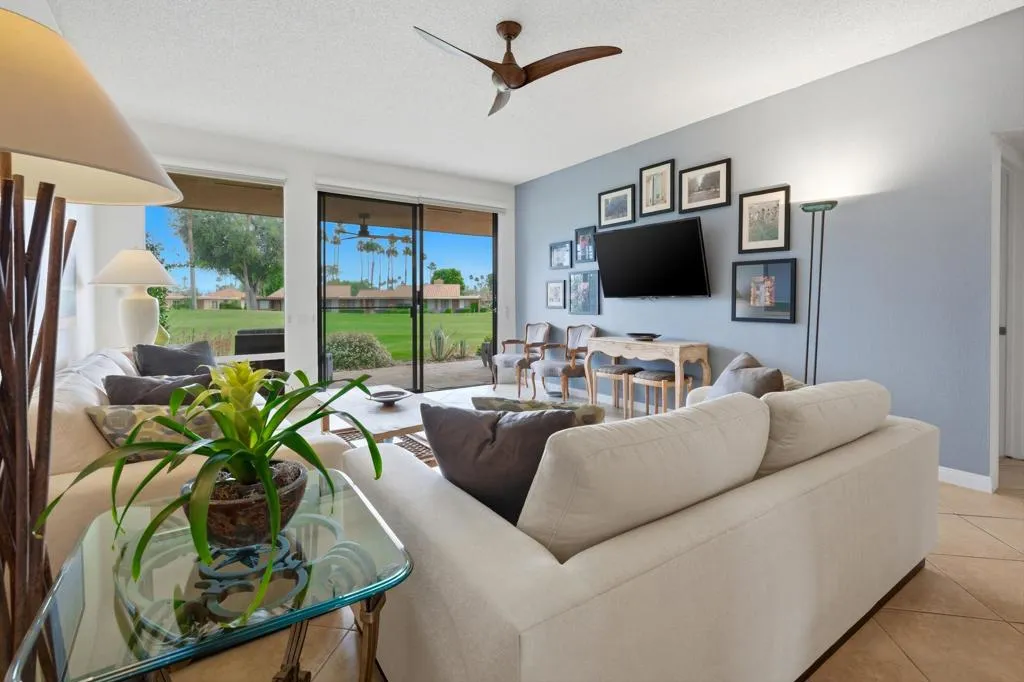 Open House March 7th 11am to 2pm. 91 La Cerra Dr. is located in Sunrise CC on a single sided street adjacent to Thunderbird Terrace. This area benefits from fewer neighbors and traffic then other sections of the club. Tastefully updated with a few well thought modifications to the interior. The kitchen has been opened for easier access and a neat dry bar with wine cooler has been added. Immaculate 2 bedroom 2 bath condo with interior location in Sunrise CC. Eastern Golf course views from the living area and back patio, Mountain views in the large front courtyard. The current owner is a landscape designer and has nurtured a one-of-a-kind garden in the front courtyard. The Primary bedroom has walk in closet plus an extra closet with built ins. Ideal Rancho Mirage location, near The River, The Gardens on El Paseo, Annenberg Estate, Disneys Cotino, dining, shopping and Eisenhower Hospital.