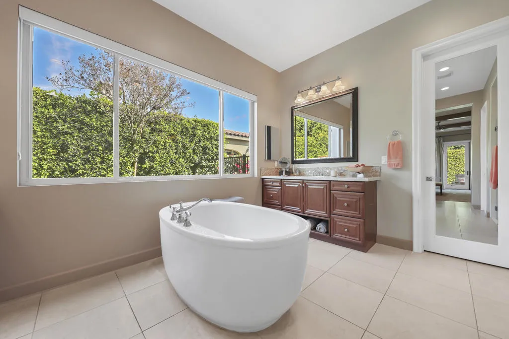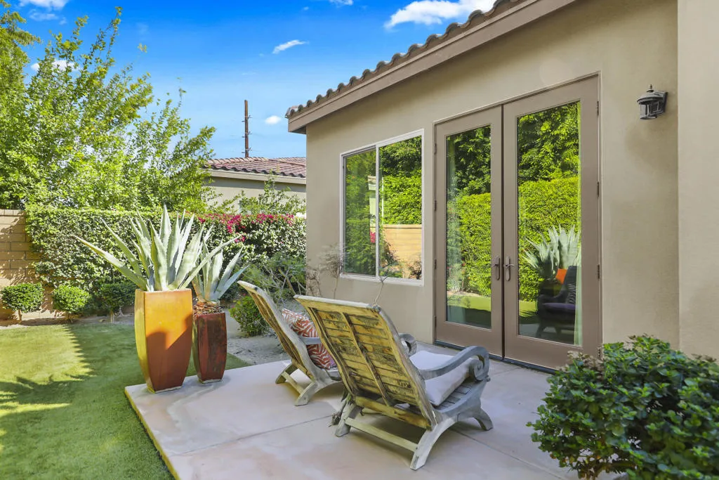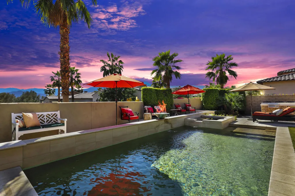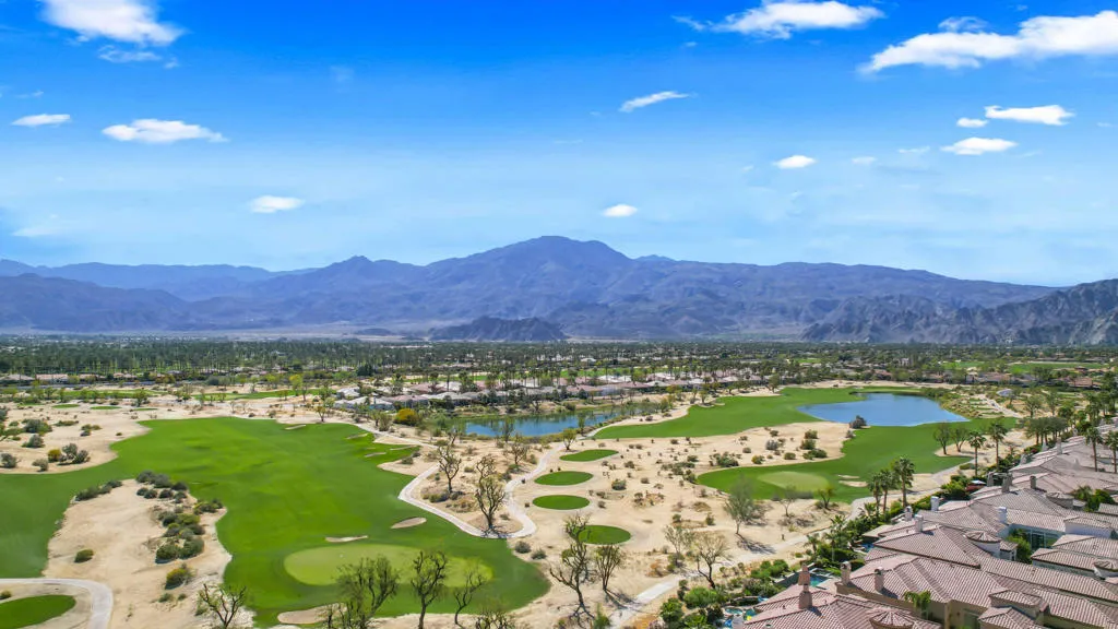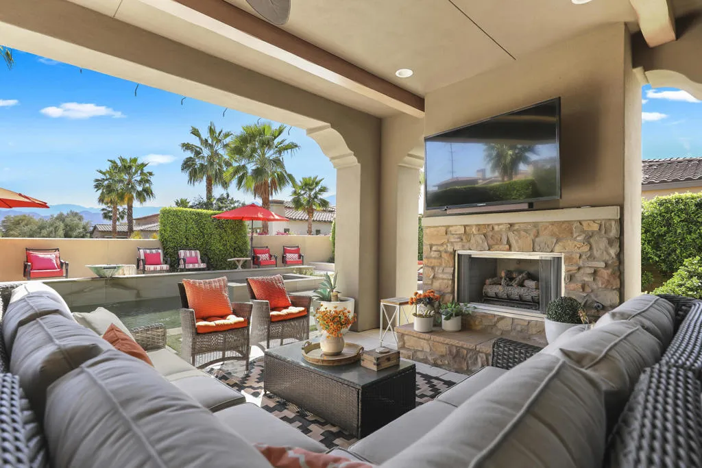 The Private Enclave of Monterra at PGA WEST, is situated within The Greg Norman Course, renowned for legendary golf and lifestyle. This private luxury home is an oasis of beauty with the majestic Santa Rosa mountains as a back drop view, on a oversized cul de sac lot. The perfect sanctuary in a secluded setting for an indoor outdoor entertaining and enjoyment of Desert lifestyle. This beautiful home was the builder's model of Residence One, therefore there are upgrades galore! The great room living and dining area surround the gourmet kitchen with 48'' dual fuel gas range with Designer Hood & oversized island and sink prep area. The living areas are accented by high ceilings and warm welcoming fireplace. The south facing wall of retractable glass doors brings the out door living area indoors. The expansive patio features a dramatic stone fireplace & big screen TV, built in BBQ, putting green, relaxing pool & spa, lounging and dining areas.Easy access to the kitchen for delightful out door entertaining. The grandeur of the colorful mountain scenery compliments this outdoor living space to kick back and relax in your own paradise! Once inside this luxurious home; enjoy the beautiful custom designer decorated interior, specifically for this home's free flowing floor plan. The guest suites are all ensuites, the fourth bedroom is presently used as a study/office space. The spacious Primary suite is complimented with light shade of wood beamed ceiling accents, & an abundance of windows for a restful and airy space. The oversized luxury bathroom and dressing area with dual vanities, custom framed mirrors and marble slab countertops, and separate shower, surrounding an oval floating tub. Everything about this home is about comfort and Desert Lifestyle !The garage has space for 2 cars and a golf cart.