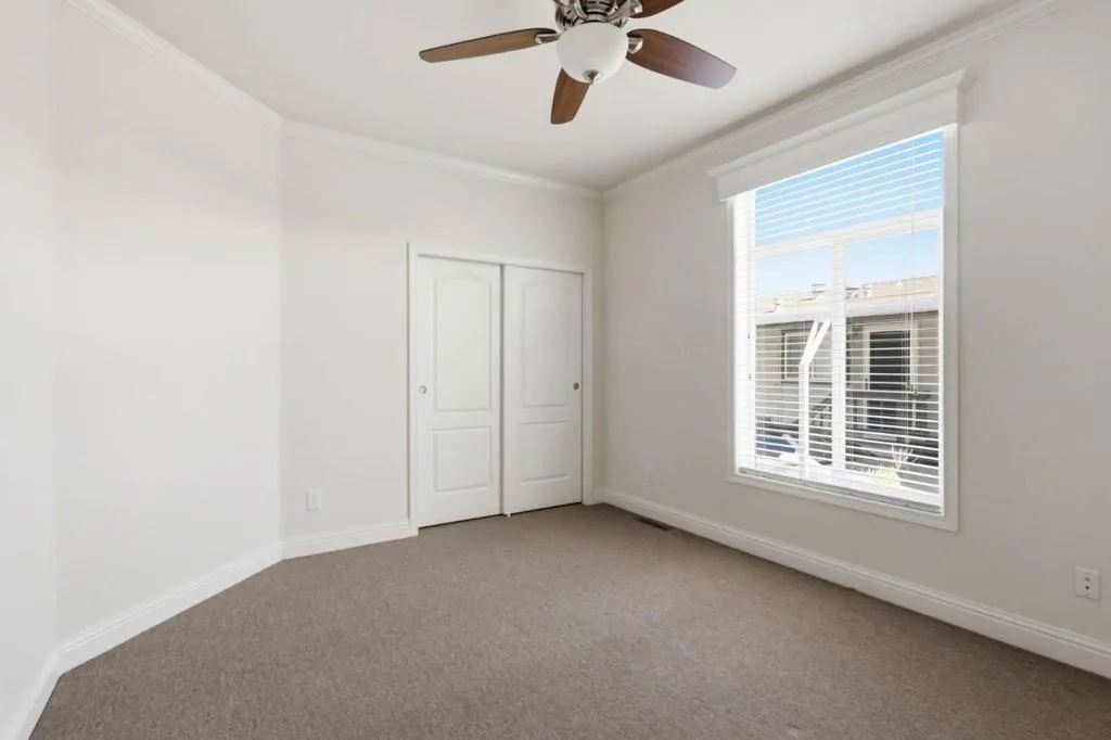Spacious 2012 Skyline residence offering approximately 1,620 sq ft of thoughtfully designed living space in one of Sunnyvales desirable communities. This popular floor-plan offers a well-balanced layout rarely found in homes of this size. The home welcomes you with a proper foyer and coat closet, 9-foot ceilings, elegant crown molding, and laminate flooring throughout the main living areas with comfortable carpet in the bedrooms. Inviting kitchen features hardwood cabinetry, stone countertops, stainless steel appliances, ideal for everyday living and entertaining. Beautifully maintained and well cared for, the home is exceptionally clean and truly move-in ready, with air conditioning providing year-round comfort. Outside, enjoy a beautifully finished lot with pavers, tasteful low-maintenance landscaping, and a custom storage shed. Ideally located within the community for easy access in and out. Residents enjoy resort-style amenities including three swimming pools, a beautiful clubhouse, and a fully equipped fitness center. Conveniently located near many of Silicon Valleys major employers, shopping, dining, and commuter routes.