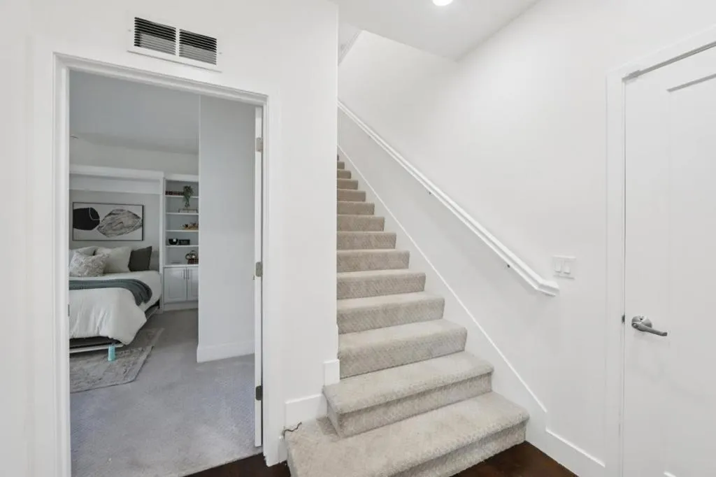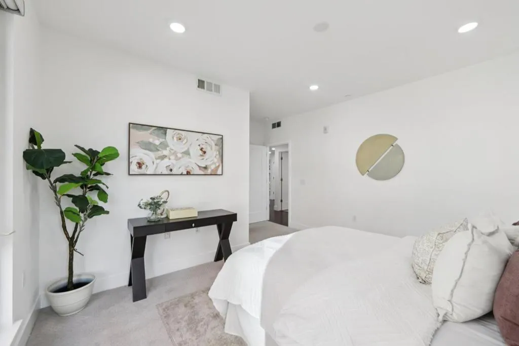 Welcome to this modern, resort like, light filled corner residence the only 2 story townhouse style condo in the community featuring 2 spacious balconies with direct park views and an attached 2 car garage. This home offers 3 bedrooms and 3 full bathrooms, including 2 private suites and a large walk-in closet in the primary bedroom. The HOA fee is exceptionally reasonable at $564 per month. The home features a desirable layout with a first floor suite, complete with a built in queen size Murphy bed, custom cabinetry, and its own private walk out balcony. A single flight of stairs leads to the main living level, where the open concept design is enhanced by abundant natural light and additional windows unique to its corner location. Premium hardwood flooring runs throughout the living areas, complemented by newly installed carpet. The gourmet kitchen anchors the home with expansive countertops, sleek cabinetry, and brand new premium stainless steel appliances. Meticulously maintained in like new condition, the home includes an attached side-by-side 2 car garage with epoxy flooring and custom built in cabinetry. Ideally located with easy access to Highways and minutes from Great Mall, Shopping, dinning and Milpitas BART/VTA. Assigned to Northwood Elementary.