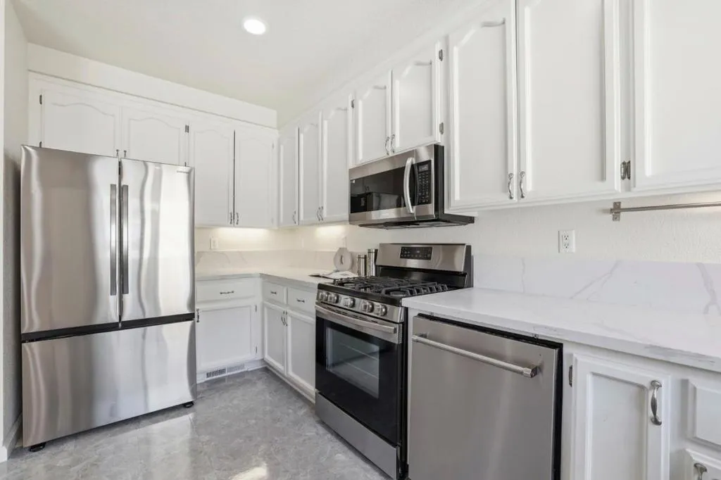 Welcome to 4641 Hampton Fall Pl, a beautiful high-ceiling, east-facing 1,805 sq. ft. home that combines spacious living, abundant natural light, and a peaceful setting. This residence features 2 expansive primary suites and 2.5 elegantly designed bathrooms. Newly upgraded, the home boasts luxury waterproof vinyl flooring, carpet, and tile throughout. The fully remodeled kitchen features Calacatta quartz countertops, modern lighting, and stylish finishes, perfect for everyday living and entertaining. Freshly painted throughout, including the two-car side-by-side garage, the home also offers central A/C and heating for year-round comfort. Step outside to the generous private patio, an ideal retreat for relaxing or entertaining. The community provides ample parking, a pool, and a soothing hot tub, with HOA covering water and trash for added convenience. Conveniently located in the heart of Silicon Valley, this home is just minutes from Whole Foods, Trader Joe's, Costco, 99 Ranch, Oakridge Mall, Almaden Lake, Martial Cottle Park, and scenic hiking and biking trails. Commuters will appreciate easy access to Downtown San Jose and the Peninsula's world-renowned tech campuses. Don't miss the opportunity to make this move-in-ready, beautifully upgraded home yours today.