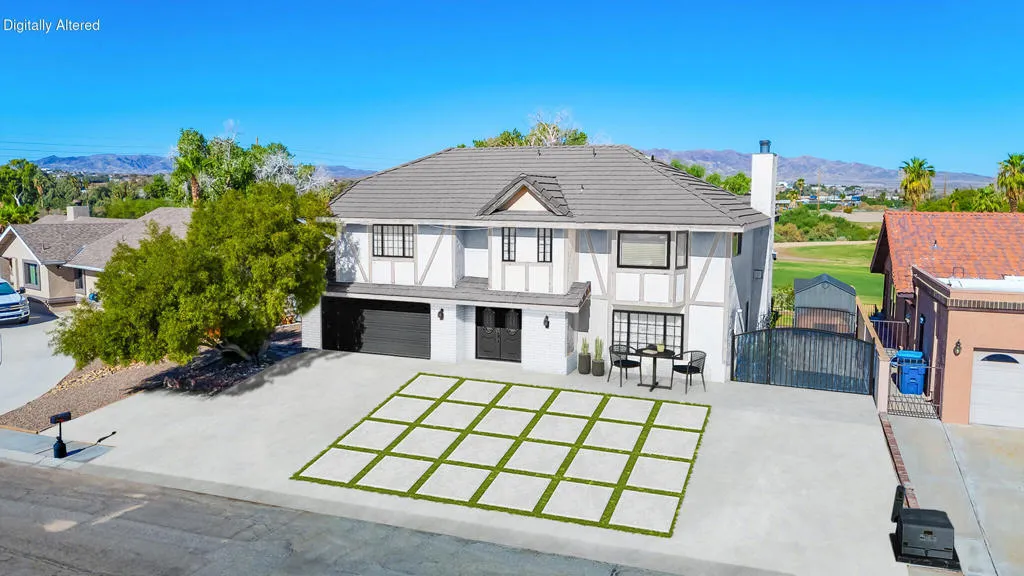 MOTIVATED and priced to move! River paradise! Value and opportunity! See AI renovation photos to envision your home your way and add massive equity potential. Double door entry to big downstairs office/den/guest room with private additional entry. Large living room with fireplace connects to Massive kitchen with granite countertop and bar/eating too. Golf course views! Solid Oak cabinetry with office/desk area next to pantry. Additional big formal dining/ guest room off kitchen leads to garage and also out to back yard patio. Upstairs a spacious double wide master suite with fireplace and gym/seating/flex space. Master bath with huge jacuzzi tub, full separate shower and dual sink vanity. 3 additional bedrooms and full bath with large Oak cabinetry center in hall for supplies. Garage is two car with laundry LG washer/dryer and two car parking in driveway. Additional RV/boat driveway over 11' wide with large custom iron gate and additional walk in gate attached. Massive back yard would easily accommodate a pool, pickleball court, outdoor kitchen/dining, and firepit seating area to unwind and enjoy the sunset or full moon. Two patio covers, stone pavers, garden shed/adu space?, open view iron fence on the golf course and majestic sunset views to the western mountains.