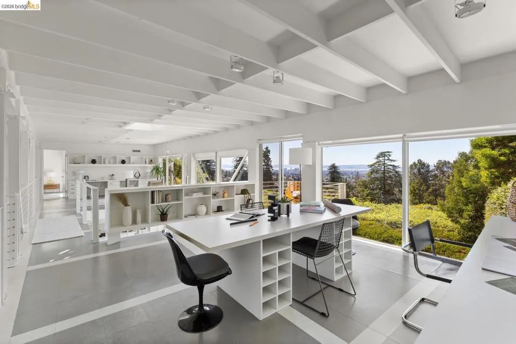 Panoramic Golden Gate views from this extraordinary modernist residence - clean geometric lines, refined minimalism, and dramatic use of light with expansive floor-to-ceiling windows and glass doors that create seamless indoor-outdoor flow to a large view deck. The open floor plan is centered around a tranquil courtyard - then enter via dramatic two-story living + dining area. 3BRs/2BA on main level, with upper gallery-style family room and office that connects to the private primary suite with sweeping western views. Central heating/cooling, newer systems. A large full-height basement offers huge flexible space for studio, workshop, music and wine storage. Gated entry, wide driveway, and detached two-car garage provide ample off-street parking. Designed by noted modernist architect Don Hisaka, whose work is recognized for its bold geometry, minimalist elegance, and masterful use of light. Sited on a large private lot with its own oak grove in the desirable Lower Claremont Hills, this remarkable property offers serenity, architectural pedigree, and convenient access to nearby shops, dining, and transportation. BESO Score 4 Views: Downtown