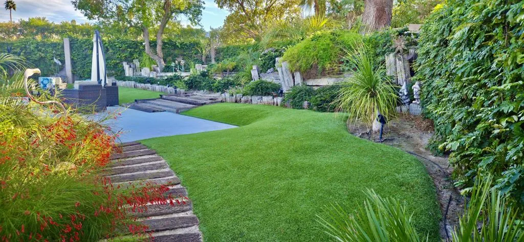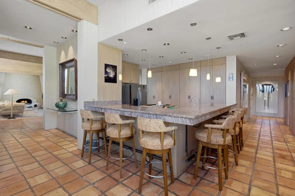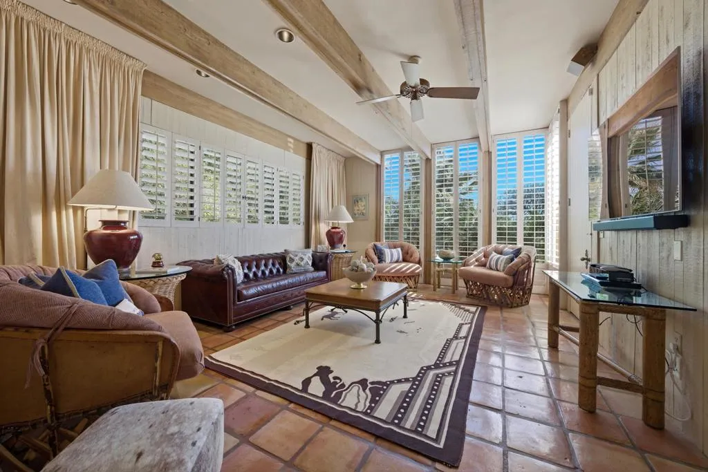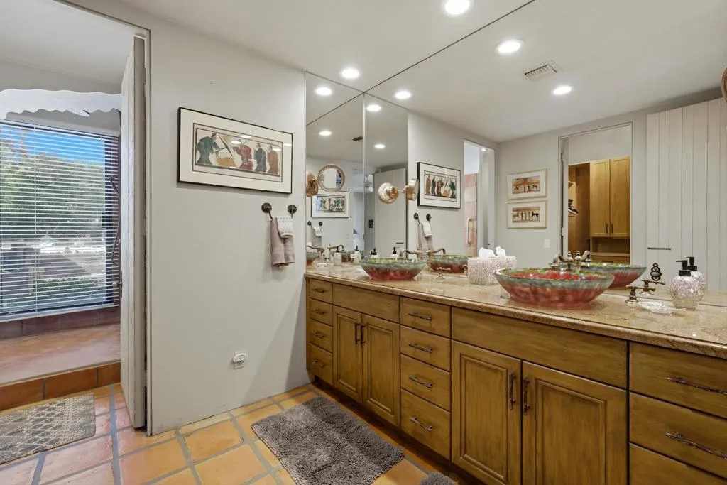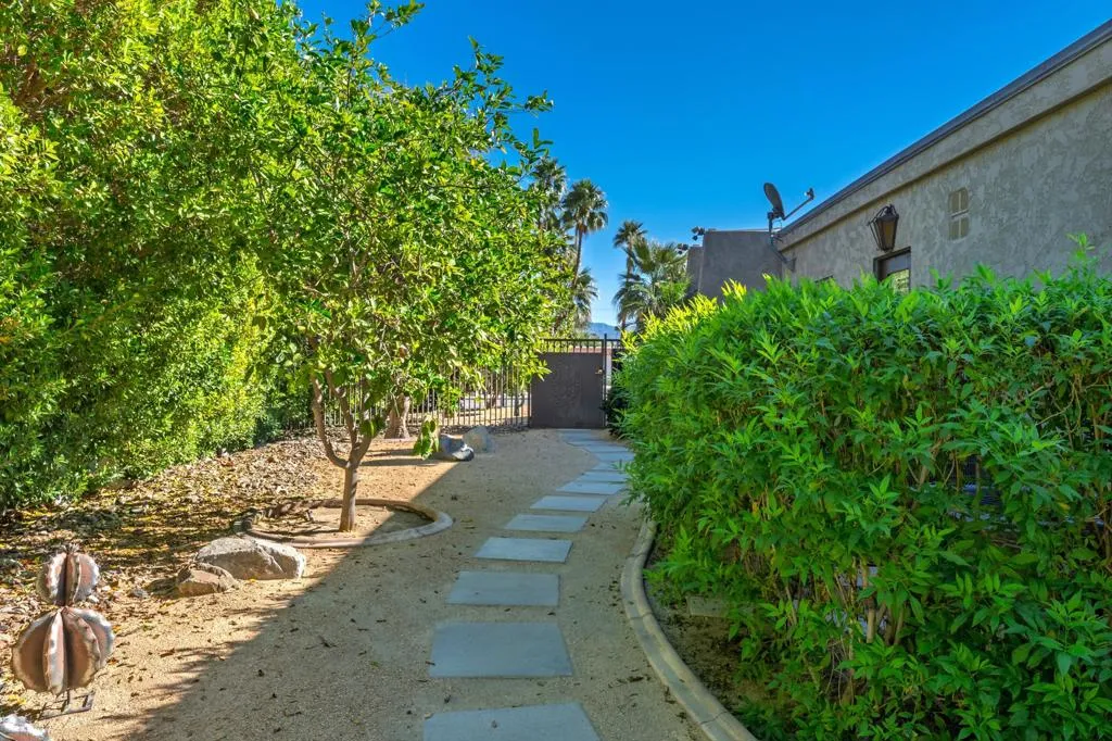 At the end of the rainbow lies this shan-gri-la. Built by famed Hollywood producer, John Conboy, for his personal desert home, and what a master piece of lush greenery surrounded by lighted palm trees, meandering paths, fruit trees, with the desert mountains pouring into the backyard as if to say they approve of this desert oasis. The ambience is too irresistible to ignore. It pulls you to every corner of the lovely property. At night, the home comes alive with strategically placed lighting and hardwired music to soothe the soul. Have an evening with friends in this majestic place with its very own Bocce ball court, an outdoor kitchen equipped with a refrigerator, large BBQ, sink, ice chest, 6-person bar, and a large TV--the sounds of the fountain in the pool surrounding you. Now let's step inside this custom home, featuring Sentilla tile, custom solid wood paneling, stereo system Garden Security Gates with codes to enter yard, Electric fans span over the oversized covered porch, Rambling yard with views of mountains, Bocce ball court with patios for viewing, Enjoy sweet fruit from the Orchard of over 8 fruit trees, an abundance of cabinets, Large pool with water fall, with an attached but separate hot tub with jets, Yard provides views but total privacy, Indoor/outdoor living with sliders to outside, Corner Lot with amazing street presence, Custom made oversized front doors with custom made iron door knobs that make an instant impression, Convenient garbage area right outside side door Security Alarm, Air conditioned 2 car garage with abundant storage with app controlled garage door & Code Pad, 3 air conditioning units controlled with nest thermostats, Ceiling Fans in every room, 11 Foot Ceilings throughout Home, Solid Wood Beams in Great Room, Kitchen, and Casita, The large oversized Bee Hive fireplace in the living room provides a fun vibe while decorated with comfort and warmth, Custom solid wood paneling throughout the home, Custom solid wood shelving in primary and guest bedroom, Custom iron forged door hardware throughout home, Extra wide hallways lending themselves to a home art gallery, Enjoy views from every room with the oversized tall windows throughout the home, Custom full-size solid wood shutters throughout the entire home, Large primary suite with full bath and walk-in closet with a door connecting to the back yard, 2 additional bedroom suites with walk-in closets, with a jack and jill bathroom.
