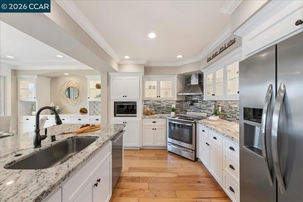 Beautifully remodeled Sonoma from Town Park Restoration, with designer finishes in the sought-after 55+ community of Rossmoor. This light-filled home features an upgraded chef’s kitchen with stainless steel appliances, stone countertops, under-cabinet lighting, and custom wood and tile flooring flowing throughout the home. Elegant details include recessed lighting, coved ceilings, window treatments, and a cozy electric fireplace. The extended living room offers a versatile enclosed space ideal for a home office, hobby room, or craft studio, plus access to an open balcony perfect for enjoying sunshine and peaceful views. The spa-style bathrooms include a large stall shower in the primary suite and a large walk-in tub in the guest bath for comfort and accessibility. Conveniently located close to the carport, this home is part of the vibrant Rossmoor lifestyle featuring golf, pickleball, tennis, lawn bowling, hiking trails, swimming pools, fitness center, and more than 230 clubs and social activities. Experience resort-style living in one of Walnut Creek’s premier active-adult communities.