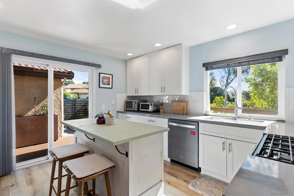 Nestled in a private, end-unit location in the highly sought-after Avenue of the Trees community. Surrounded by lush greenbelt & open space, the home lives like a single-level, with both primary & secondary bedrooms situated on the main floor. The upstairs loft with a WIC is an optional 3rd bedroom. The expansive living room showcases soaring vaulted ceilings, a cozy fireplace, abundant natural light, & seamless access to the patio. The updated interior features wide-plank luxury vinyl flooring, quartz countertops, stainless steel appliances, & modern lighting. The spacious primary suite includes a double vanity ensuite bath. Outdoors, enjoy a wraparound Trex deck enveloped by mature landscaping & peaceful nature views. With multiple seating areas across upper & lower deck spaces, plus a pre-plumbed gas line for a future firepit.. Additional upgrades include a powder-coated aluminum privacy fence and a recently updated roof with new underlayment & tiles. The owned solar system consistently offsets annual electricity costs & a recently installed high-efficiency Mitsubishi ducted heat pump system providing 3-zone heating & air conditioning. The full two-car garage offers ample storage, including overhead truss space, plus an additional dedicated parking space in front of the home. Residents enjoy HOA amenities including a pool, spa, & tennis courts, with a convenient walking path directly from the backyard to these features. Located West of El Camino Real, 1.5 miles from the beach, & quick access to Highways 78 and 5. Won't last.