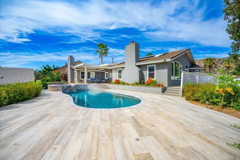 Welcome to 15715 Ziegler Court, Ramona, CA 92065 — a thoughtfully redesigned luxury residence located on a quiet cul-de-sac within the highly sought-after community of San Diego Country Estates. This single-level home spans approximately 2,544 square feet and includes a fully insulated attached three-car garage and a detached ±1,000 square foot 2-bedroom, 1-bath ADU currently generating $3,000 per month. The interior remodel was completed under the direction of La Jolla–based designer April Worrell, delivering a refined, cohesive finish throughout. Quartzite porcelain tile flooring and designer-selected backsplashes create continuity across the main living spaces. The kitchen anchors the home with custom solid wood cabinetry, designer pulls, an alabaster-surfaced island, Bosch and ZLINE appliances, a Kraus single-bowl sink, under-cabinet lighting, and a dual 650 CFM industrial-grade exhaust system. The primary suite is finished with a Bain Ultra stone soaking tub, cultured limestone walk-in shower, Toto fixtures including a Washlet system, and curated plumbing and lighting selections. Additional upgrades include vinyl windows and sliders, Emtek door hardware, new HVAC ducting, whole-house exhaust fan, new 50-gallon gas water heater, fresh interior and exterior paint, and concrete tile roofing. Energy performance is a defining feature of the property. A + / - 14,400 kW owned solar system, two Tesla 3 backup batteries, and a SPAN programmable electrical panel provide long-term efficiency and resilience with minimal electric utility expense. The back yard is designed for both relaxation and entertaining, highlighted by an IGG PebbleTec pool and spa with non-slip porcelain tile decking and a new Pentair pool heater. Landscaping includes a curated cactus garden installed by Moon Nurseries, along with mature lemon and pink lemonade fruit trees. The property is supported by one 500-gallon and one 250-gallon propane tank. Backing to large private land holdings adjacent to thousands of acres of public land, the setting offers privacy and open-space views rarely available within the community. 15715 Ziegler Court presents a rare opportunity to acquire a fully remodeled luxury residence with income-producing ADU in one of Ramona’s most desirable neighborhoods.