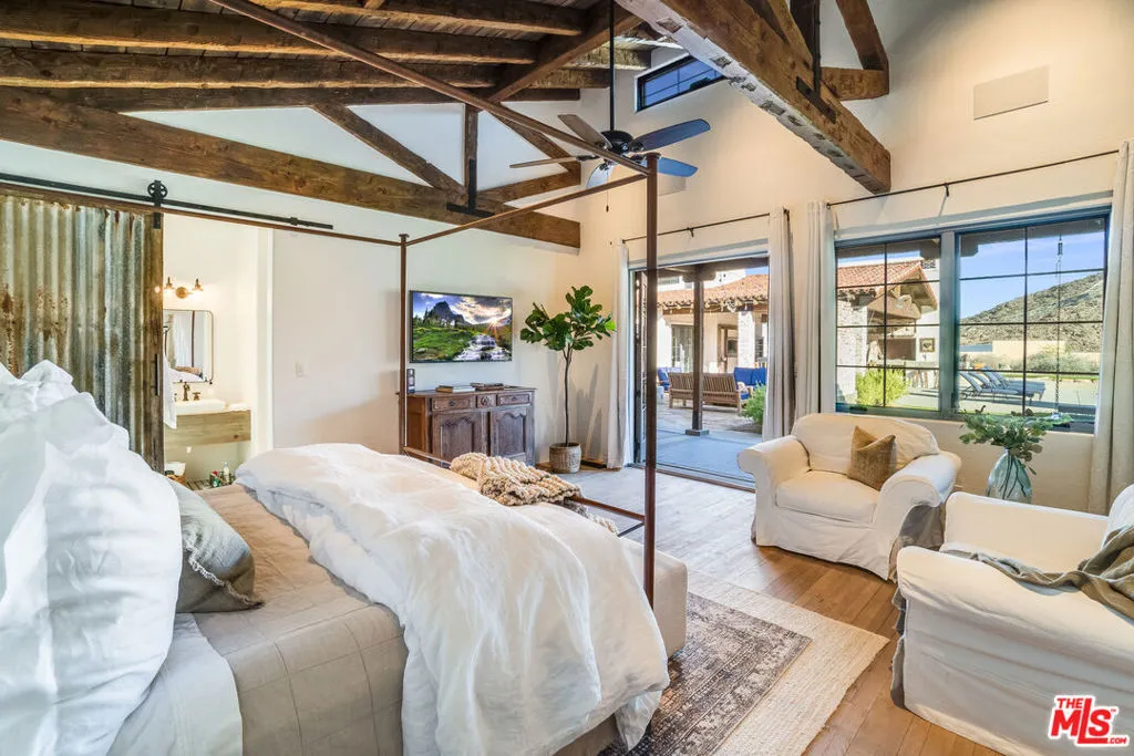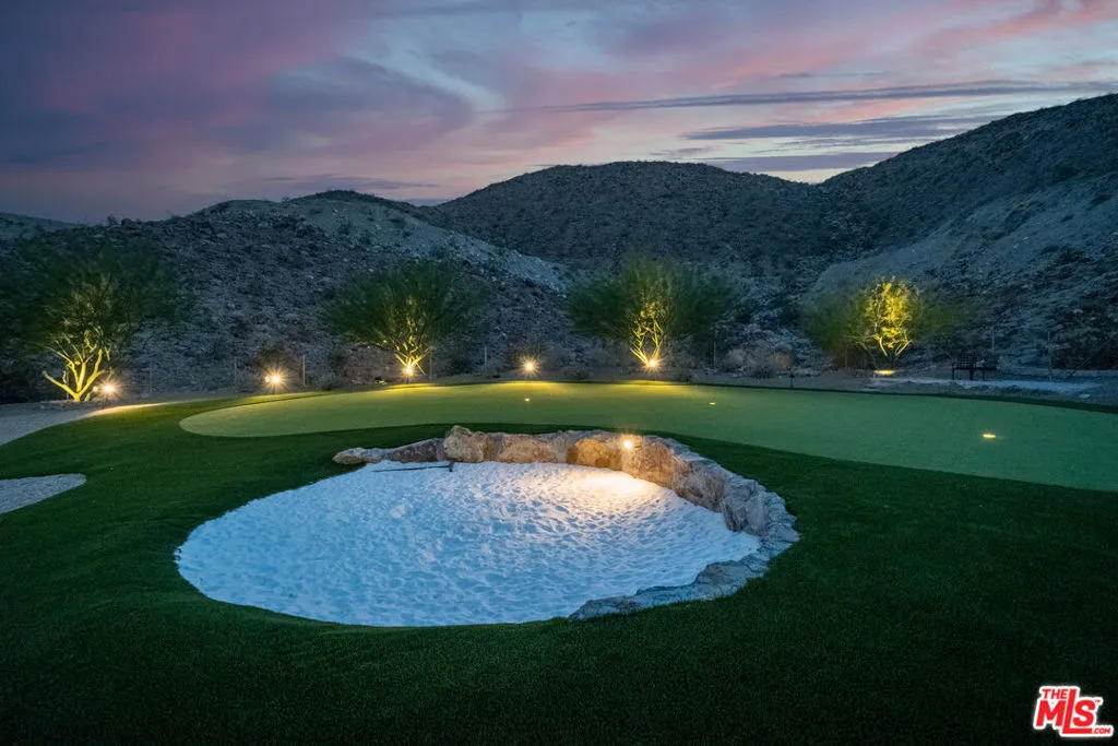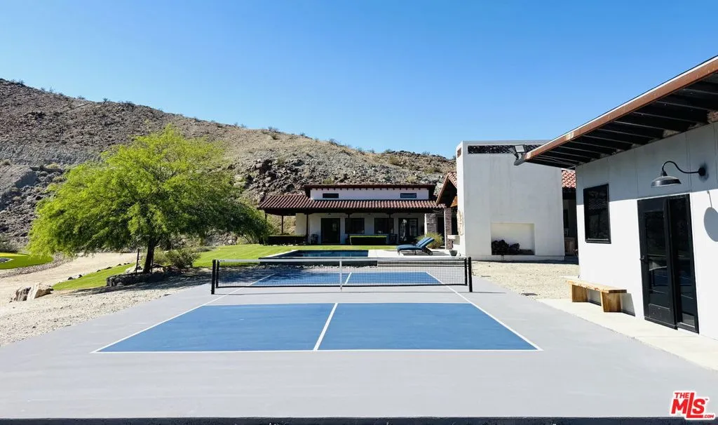 Situated at the end of a peaceful cul-de-sac in Rancho Mirage, this extraordinary 2+ acre California Spanish Estate known as "Kanyon Ranch"offers one of the most exceptional residential settings in the area. From the moment you arrive, the energy of the desert fades away, replaced by the serenity of your own private entertainer's paradise.Custom-built in 2019, the residence features four spacious en-suite bedrooms. A detached ADU with its own en-suite bath brings the total to five bedrooms and seven bathrooms, offering ideal accommodations for guests or extended family. Culinary enthusiasts will find true kitchen nirvana here. Designed for both everyday living and grand-scale entertaining, the chef's kitchen is equipped with multiple ovens, a wood-burning pizza oven, a salamander indoor grill, an open-hearth wood-burning oven, an oversized walk-in pantry, and temperature-controlled wine storage.Outdoors, the expansive and tranquil grounds stretch toward the dramatic Santa Rosa Mountain backdrop, creating a striking natural focal point. An open-air entertaining pavilion invites both lively celebrations and relaxed evenings, complete with a fully equipped outdoor kitchen designed for hosting unforgettable gatherings.The resort-style grounds feature a tiled pool and spa, an outdoor fireplace, a fire pit, and a full-size pickleball/sport court. Golf enthusiasts will appreciate the private one-hole golf course with a white sand bunker perfect for practicing chip shots. A 15-seat private theater provides a luxury viewing experience worthy of Hollywood premieres or binge-worthy series nights. The home is equipped with indoor and outdoor surround sound as well as a comprehensive security camera system, ensuring both entertainment and peace of mind.Ample parking includes an attached three-car air-conditioned garage and driveway space for approximately 20 additional vehicles. A secondary detached air-conditioned garage suited for an RV or 5 additional vehicles keeps every adventure within reach. This is a rare opportunity to own a truly one-of-a-kind desert retreat.
