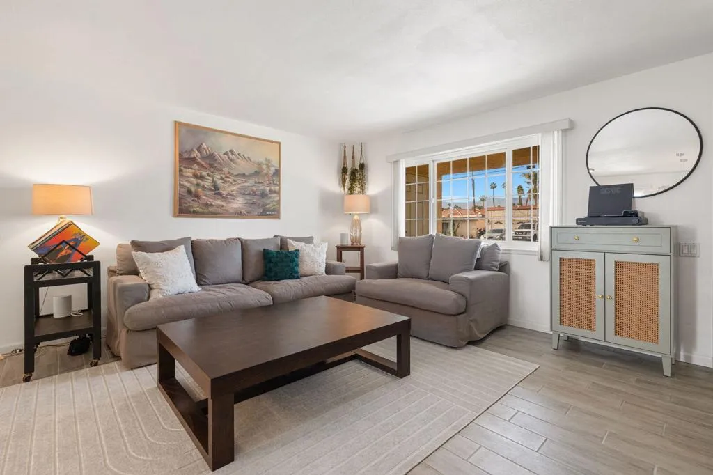 Welcome to this beautifully remodeled 2-bedroom, 2-bath residence that seamlessly blends modern design with relaxed desert living. The home showcases an open-concept layout ideal for both everyday comfort and entertaining.The stylish kitchen anchors the living space, featuring sleek stainless steel appliances, abundant cabinetry, and clean contemporary lines. Wood-plank tile flooring runs throughout, providing durability and a cohesive, upscale look. New windows and doors frame stunning mountain views while filling the home with natural light, creating a bright and welcoming interior. Both bathrooms have been tastefully renovated with modern fixtures and finishes.Outdoors, the expansive fenced backyard offers privacy and tranquil golf course views. A shaded patio provides the perfect setting for outdoor dining, relaxing evenings, or entertaining guests. The circular driveway enhances curb appeal while adding everyday convenience.Located in Palm Desert Country Club, residents enjoy access to two community pools and a clubhouse just a short walk away, offering golf and dining options. This is more than a home--it's a lifestyle opportunity in the heart of the desert.Garage has a brand new mini split HVAC.Please call to schedule your private showing.