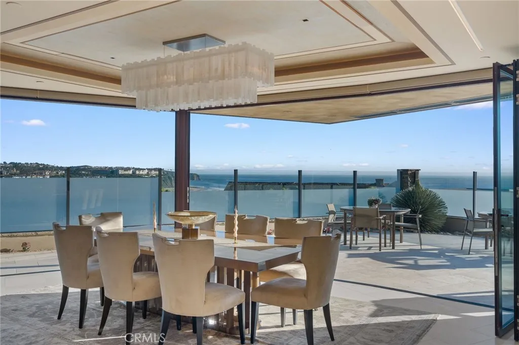 Situated within the prestigious guard-gated enclave of Monarch Bay, 20 Monarch Bay presents an extraordinary coastal retreat showcasing sweeping panoramic views of whitewater ocean, sandy beaches, Dana Point Headlands, the Ritz-Carlton, Monarch Links Golf Course, breathtaking sunsets & sparkling city lights. Completed in 2015 with exceptional craftsmanship, this meticulously designed residence embodies refined coastal luxury with an organic, sophisticated aesthetic. Smooth limestone plaster walls, elegant Crème Marfil marble flooring & curated finishes create a timeless interior, while expansive Nano bifold doors in the living & dining areas open seamlessly to the outdoors, framing spectacular ocean vistas. Custom trey ceilings & a dramatic dual-sided copper & glass fireplace add striking architectural detail. The gourmet chef’s kitchen is both functional & artfully designed, featuring a quartz crystal island with bar seating, sleek Arc Linea cabinetry, Silestone countertops & a full suite of Miele appliances. Designed for relaxation & entertaining, the home includes a soundproof, acoustically engineered theatre & family room with built-in audio, drop-down projection screen & wine storage. A comprehensive Crestron smart home system manages lighting, security, whole-house audio & theatre components, while automated shades, solar power, five HVAC zones & a tankless water heater ensure modern comfort & efficiency. The primary suite serves as a private ocean-view sanctuary with direct patio access, a custom walk-in closet & spa-inspired bath with heated floors & towel racks, oversized walk-in shower, soaking tub & skylight. Secondary bedroom suites feature designer finishes & outdoor access. Resort-inspired outdoor living spaces include multiple entertaining areas, a Wolf-equipped BBQ island, outdoor fireplace, spa with cascading fountains, retractable awnings, outdoor speakers & shower. A landscaped front courtyard with fountain & a finished two-car garage with lift for two additional cars complete this offering. Residents of Monarch Bay enjoy access to tennis & pickleball courts, a community & dog park, playground & the private beach club with indoor-outdoor bar, beachfront dining, firepits & towel, chair & umbrella service. Ideally located near hiking trails, world-class golf & surfing, and premier coastal resorts including The Ritz-Carlton, Waldorf Astoria & The Montage, this property will also benefit from the Dana Point Harbor revitalization project.