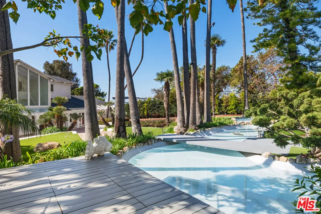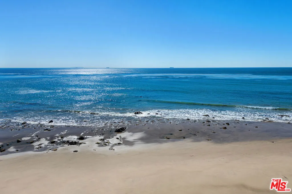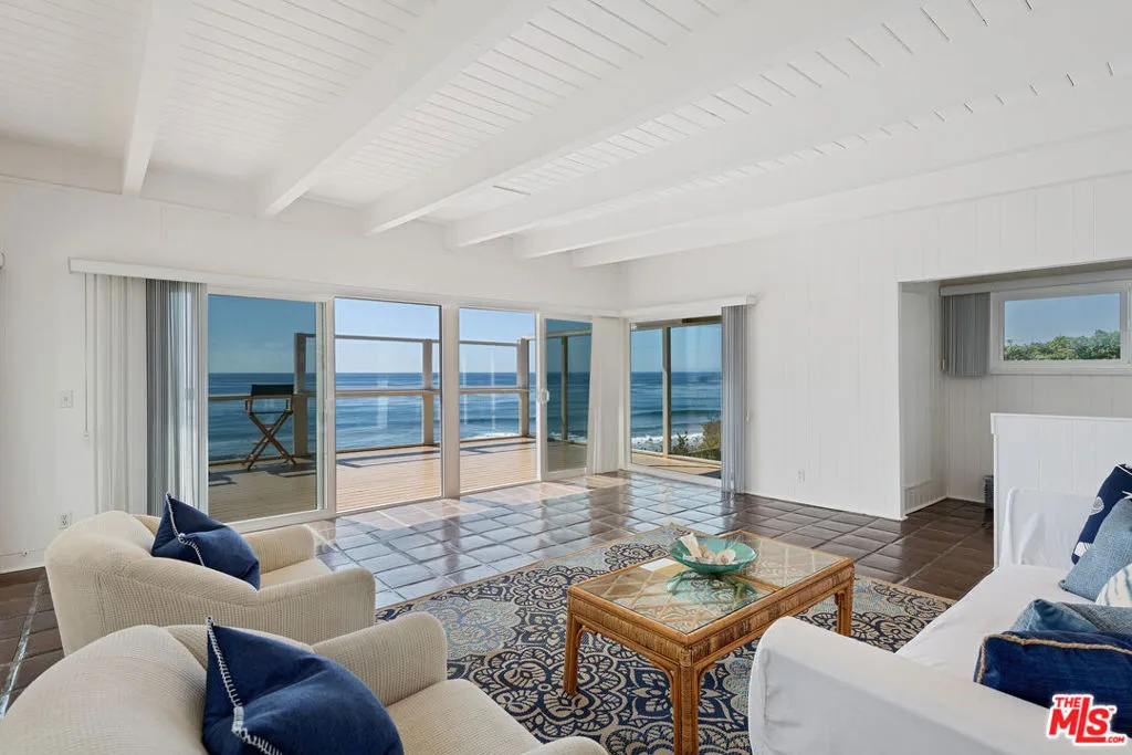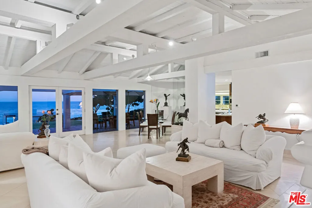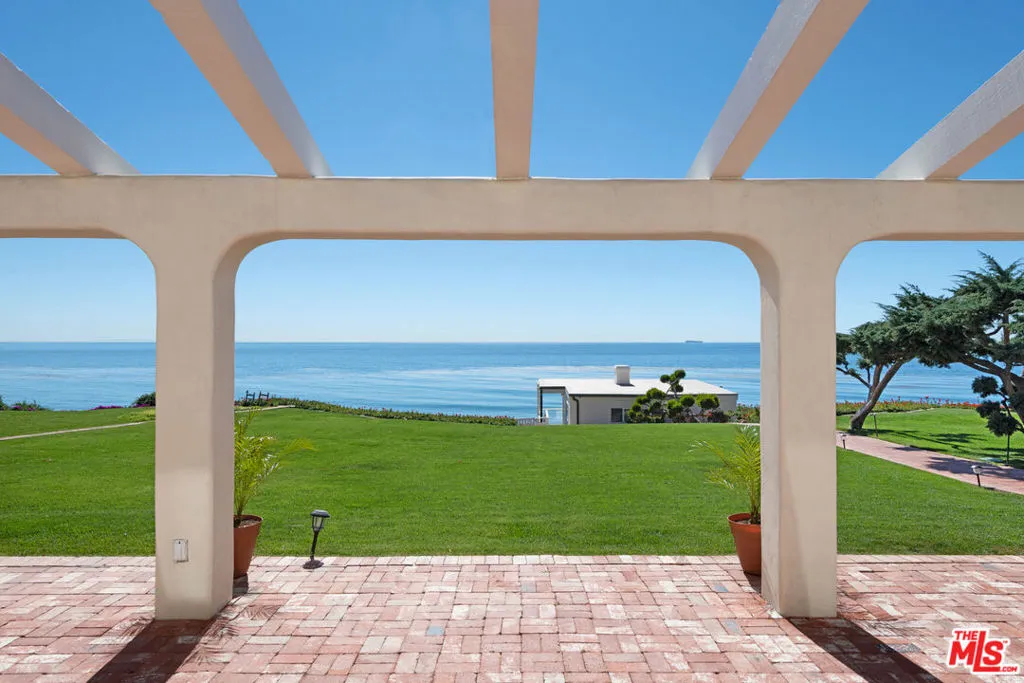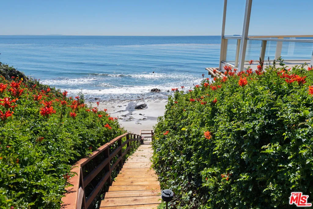 Views! Views! Views! This dramatic Cliff May-designed oceanfront compound with two guesthouses on approximately 1.9 acres and 131 feet of beach frontage is exceptionally private, with expansive outdoor spaces to complement tranquil interiors. Sitting behind gates, the property welcomes visitors with a manicured garden, circular driveway, and a meandering waterway with bridges and waterfalls. The four-bed, five-bath main house, with a two-car garage and ocean views from nearly every room, has a distinctive soaring glass wall that illuminates the interior stairway. Warm and inviting rooms have beamed ceilings, stone and hardwood floors, and wide French doors that open onto vast verdant lawns, gorgeous mature trees, and panoramic ocean views. A huge ocean-view living/sitting/dining great room with massive beams has a large fireplace and a wall of glass doors onto a brick portico with a sheltered outdoor dining area. The kitchen is fully equipped for entertaining, with an approximately 4.3x4.3 tiled interior refrigerator, a large two-tier island, a breakfast bar with seating indoors or out, and glass accordion doors that open to the patio and outdoor dining area. Also on the main floor is an enormous billiards/entertainment/media space with a full wet bar and French doors to an outdoor patio and gardens. The upstairs rooms have beamed cathedral ceilings and include an enormous, approximately 1300s.f. gracious owners suite. This beautiful room has a fireplace with sculptural plasterwork and a whole-tree mantel, expansive windows, wide French doors that open onto an ocean-view balcony that runs nearly the full width of the house, a second interior balcony overlooking the front gardens, plus a luxurious marble bath with sunken tub, custom closets, reading nook, and a laundry chute. The suite also includes a handsome ocean-view office with hardwood floors, a wraparound built-in desk and shelving, and a balcony facing the front gardens. The house also has a full attic, sound and security system, and landscape sprinklers. With unobstructed ocean views, guesthouse #1 is perfect for whale watching with a large wraparound deck, a kitchenette, adjoining half bath, and a flight of stairs that descend to the beach. The bright and sunny guesthouse #2, with a two-story ceiling and lots of glass, has a kitchenette, three-quarter bath, and a spiral staircase to a loft bedroom. The property has several additional structures set among the trees and lawns. A charming sauna/bathhouse complete with showers, hot tub, half bath, and a lounging patio with views. There is an additional four-car garage and ample guest parking. This is truly a remarkable legacy property, with a distinguished style and majestic surroundings. Barn and Adjacent Restroom excluded.