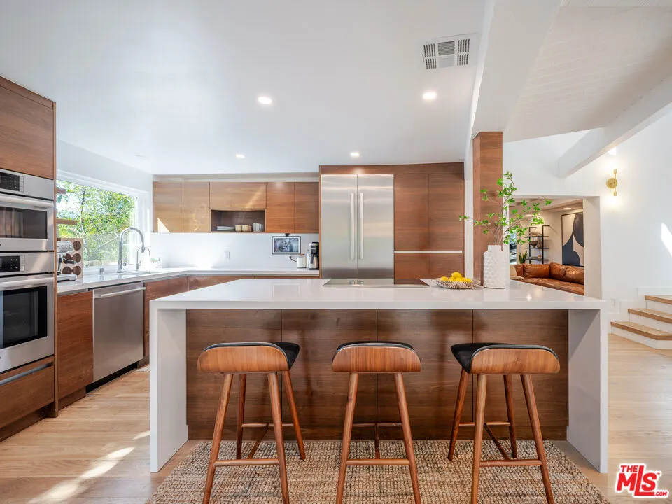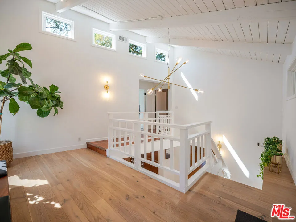 Welcome to the ultimate Topanga retreat, where modern upgrades meet timeless canyon charm. Nestled on a quiet, hidden street off Topanga Canyon Blvd, this treasure offers the perfect balance of privacy, style, and connection to nature. Inside, an open entry concept features soaring vaulted ceilings extending both levels and a modern chandelier welcoming bright natural light. Upstairs, the space leads to two bedrooms, and a crisp, updated bathroom with a classic clawfoot tub. The spacious primary suite features a comfortable additional space to relax or work, and opens to its own private deck, the perfect spot to enjoy your morning coffee while taking in tree-lined canyon views. The large deck wraps around for great outdoor entertaining under delightful string lighting. The main floor effortlessly blends contemporary design with Topanga character. The recently remodeled kitchen boasts continuous-grain walnut cabinetry, white quartz countertops, high-end built-in appliances, and a generous island with waterfall, ideal for cooking and entertaining. Large double doors open to a beautifully landscaped fully-fenced flat backyard, inviting a harmonious indoor-outdoor flow. The dining area is framed by walnut finishes perfect for gatherings, while the cozy living room invites movie or game nights. A third bedroom with a remodeled en-suite bathroom adds comfort and flexibility. The extensive list of upgrades includes beautiful oak wood flooring, new windows and doors throughout, and a whole-house water filtration system. Step through the living room to discover a bonus entertainment room and direct access to the driveway, complete with automatic gate and EV charger. In the vicinity you'll find central access to the best of the westside and the valley communities. Featuring scenic drives to nearby beaches, Santa Monica, Malibu and Calabasas. Enjoy local gems including the Topanga Community Center, playground and ballfield, weekly farmers market, Food Truck Fridays, and charming coffee shops and cafes, combining peaceful canyon living with vibrant neighborhood amenities.