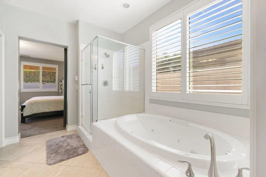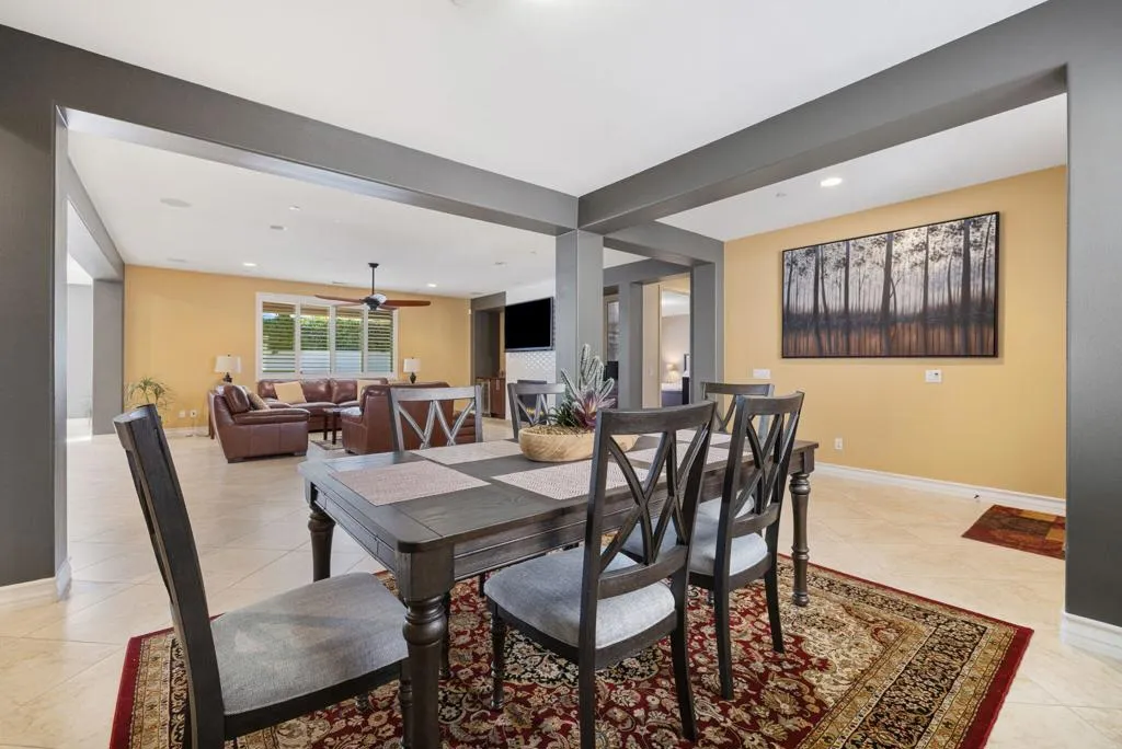 Beautiful & spacious home in the gated 'Bridge at Jefferson' community in South Indio offers almost 2,800 sq. ft. of living space with 4 bedrooms and 3.5 bathrooms. Located adjacent to the Rancho La Quinta Country Club, the property features a private courtyard entry and a highly functional floor plan. Offered fully furnished.* Living Areas: Open floor plan with a modernized fireplace, built-in media niches, surround sound, and plantation shutters.* Chef's Kitchen: Equipped with granite slab countertops, stainless steel appliances, a basketweave tile backsplash, and extensive wood cabinetry.* Master Suite: Includes a barn door entry, a jacuzzi-style tub, a separate shower, and a large walk-in closet, with a layout providing privacy from the guest rooms.* Finishes: Durable tile in the main living areas and comfortable carpet in the bedrooms. Exterior and Mechanicals:* Backyard: Designed for entertaining with a saltwater Pebble Tec pool and spa, a covered patio with surround sound, and low-maintenance landscaping.* Garage: Extended two-car garage featuring extra storage space and a tankless water heater. *Location: Situated in South Indio, the home provides close proximity to major desert attractions, including world-class golf, hiking, biking, and the shopping and dining corridors of the wonderful Coachella Valley.