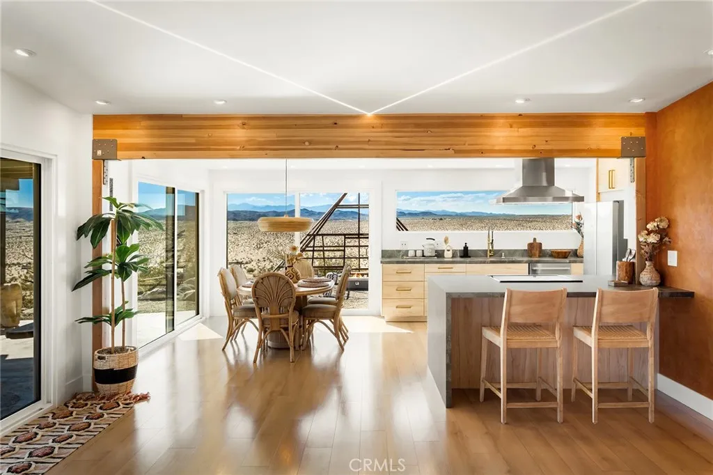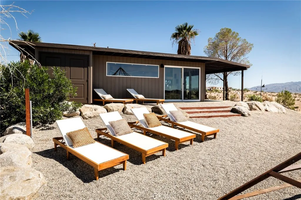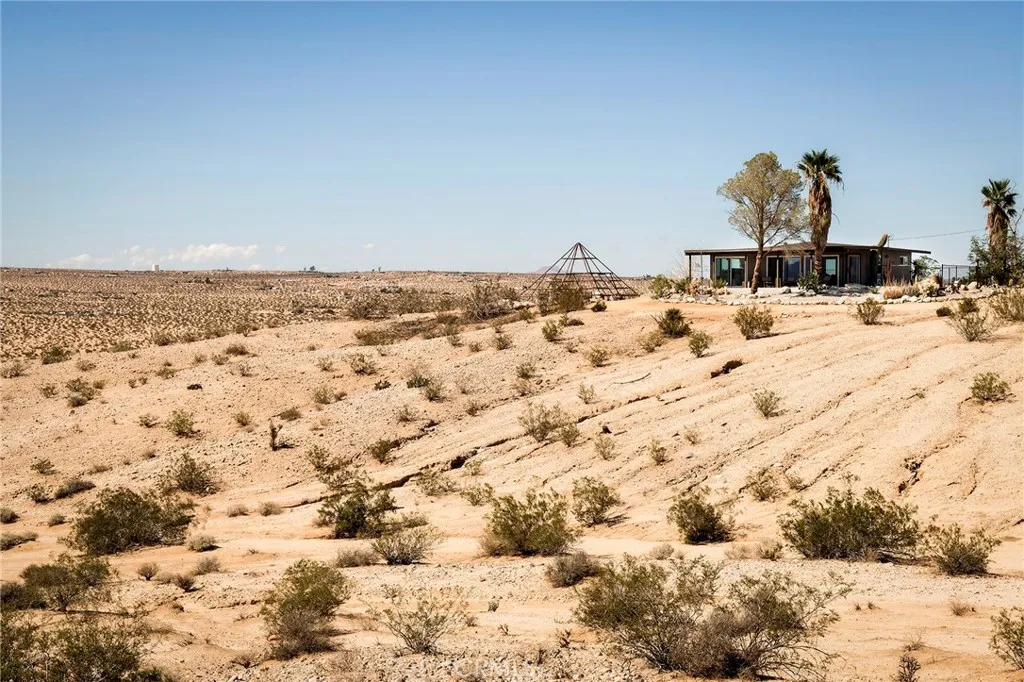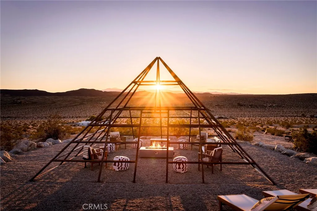 29 WEST PYRAMID HOUSE: Perched on the top of its own mountain, this striking 2-bedroom, 2-bathroom retreat delivers 360-degree views spanning Indian Cove in Joshua Tree National Park, Big Bear, and San Gregorio. Framed by dramatic imported boulders and pristine desert landscape, the property offers a rare blend of privacy, serenity, and natural beauty. At night, the dark skies transform into a stargazer’s dream, making this a true High Desert sanctuary. The centerpiece of the landscape is a bold steel-frame pyramid, measuring 24' x 24' x 14', positioned at the mountain’s edge. This dramatic outdoor structure creates a visual anchor and an unforgettable backdrop for both day and night desert living. Inside, the home is curated with Venetian plaster walls, lime wash finishes, and custom vertical plaster striping. The open floor plan is framed by expansive sliding glass doors and an 8-foot picture window, pulling the desert scenery directly into the living space. Spa-inspired bathrooms feature floating vanities, backlit mirrors, wood tile, and marble finishes, blending sophistication with soothing desert textures. A shaded porch extends from the living room, offering a peaceful vantage point for sunrise coffee or evenings under the stars. Custom channel lighting in the living room mirrors the sharp lines of the pyramid, emphasizing the interplay of geometry and desert landscape. The large kitchen showcases brand-new counters, custom cabinetry, and generous storage designed for both everyday use and stylish entertaining. Centrally located at the edge of 29 Palms and Joshua Tree, this property is just minutes from both villages, with easy access to shops, restaurants, and Joshua Tree National Park. Blending bold design, natural elements, and complete privacy, this mountain-top retreat embodies modern desert living at its finest, the kind of home you’d expect to see in the pages of Architectural Digest.