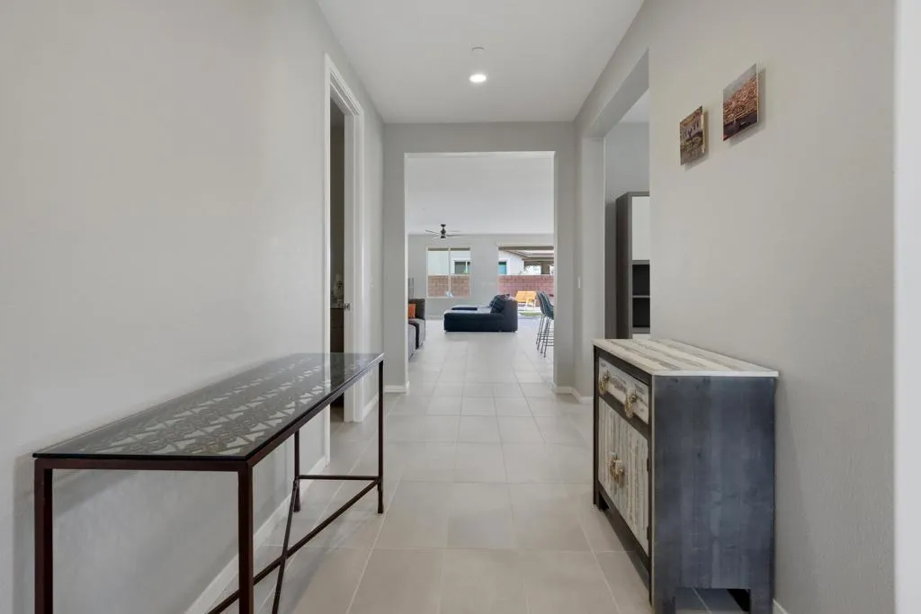 Centrally Located Near the Clubhouse - Designer Appointed Refresh Model Featuring nearly 2,000 Sq. Ft. with 2BR/2BA+Den & Built-In Office/Smart Space...This is a SHOW STOPPER. Upgrades Galore, including rolling wall of glass, unique slab counters and upgraded kitchen cabinets with loads of storage, warm gray tile floors throughout and rich plantation shutters. The popular Refresh Model lives large with no wasted space, open great room floor plan and nice bedroom separation between Primary and Guest Bedroom with nearby Den. The Smart Space off the entry features two desk areas and abundant storage. The generous outdoor living space with low maintenance desertscape and putting green offers nice South Mountain Views. The cozy gated courtyard offers paver decking and sitting area looking out the mountains. The Garage has A/C mini split. Polo Club Membership available to transfer. Make this house YOUR HOME & come experience The Trilogy Life Today!