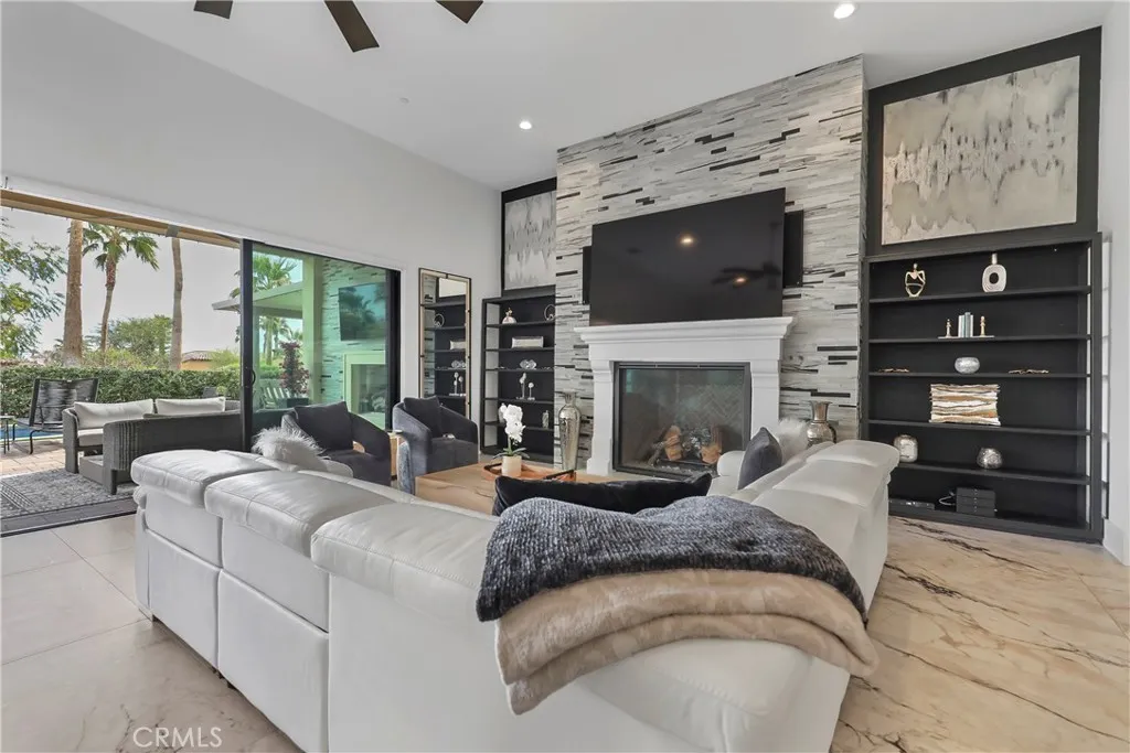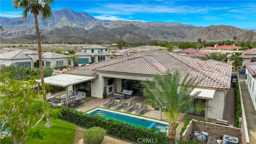 Priced to sell! This extensively upgraded home in the prestigious Stone Creek Ranch neighborhood is an exceptional value offering over $642,000 in custom luxury upgrades, owned solar, and a reverse osmosis water system located within one of La Quinta’s most picturesque gated communities. Perfectly positioned on a premium lot with lots of privacy, this stunning 3,908-square-foot residence captures sweeping sunlight along with the tranquil sounds of nearby streams and cascading waterfalls. The contemporary open layout is highlighted by soaring 12-foot ceilings in the great room, four spacious bedroom suites and 4.5 bathrooms, a striking glass-walled executive office, a designer kitchen and bar area, and a versatile flex room with barn doors—perfect for a movie room, casual living space, or potential fifth bedroom. The primary suite offers a private retreat with custom marble finishes, a custom-designed walk-in closet, and direct access to the lush backyard oasis. Additional highlights include a resort-style backyard, featuring a sparkling pool and spa surrounded by premium pavers, multiple lounging areas, two solid pergolas, a large awning with misters, and corner bi-fold doors that seamlessly open to blend indoor and outdoor living. This home is offered furnished per inventory list and has been professionally decorated in 2025. Please come and view this stunning property while it is still on the market!