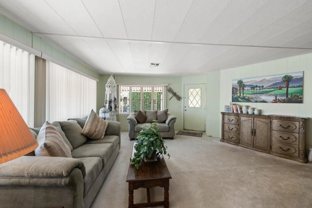 Move in ready, fully furnished. Large living room, newer furnace and water heater, gas cook top, and reverse osmosis water filter. Piping under unit has been replaced. Primary suite has a walk-in closet, dual vanities, and soaking tub. Large outdoor shed and long carport. Move in ready for your home away from home! What an opportunity to own in beautiful Palm Desert Greens Country Club where the golf is included in your ownership and you have access to pickleball courts, tennis courts, bocce ball and 3 swimming pools. Have fun in the restaurant and bar and dance to the entertainment provided. There's a lot to do at Palm Desert Greens and you don't want to miss it!