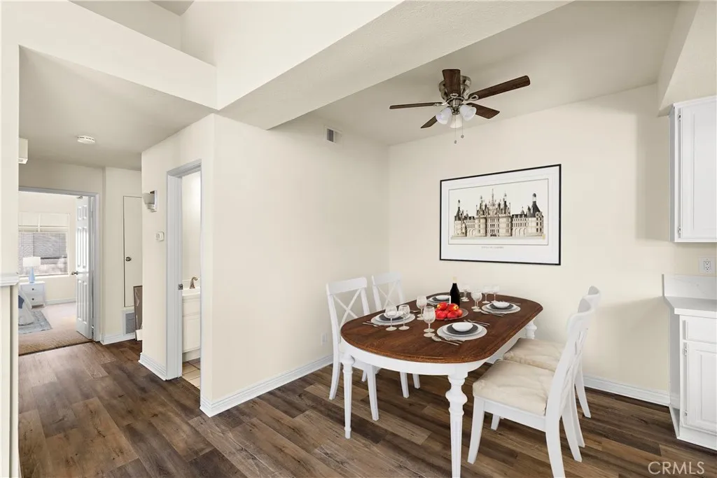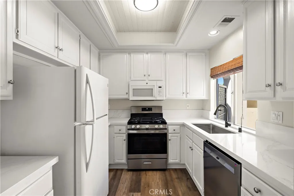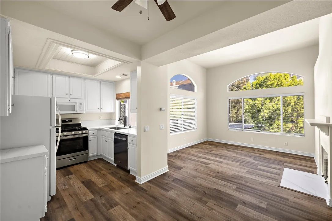 Newly refurbished Mirador upper-level condo with no upstairs neighbor. Bright and cheerful with lots of natural light. Luxury plank vinyl flooring in living room, kitchen, dining area and hallway. Carpet in bedrooms. Living room with fireplace, Adjacent dining area with new fan light. Kitchen with new quartz counter tops and new ranch style sink, gas range, microwave and dishwasher. Neutral decor throughout. Both bathrooms have new quartz counter tops and sinks, and both have new toilets as well. Spacious master bedroom has 2 closets with mirrored closet doors. The second bedroom has a wardrobe closet, double entry doors and could make an ideal office space as well. The home has central heating and AC. The private front balcony features a storage closet and lattice gate. Parking is a reserved carport #193 and features a large closet for storage of trash container. HOA fees include water and trash. The Mirador community features its own pool and spa and the property is also included in the Rancho Niguel Master Association with many additional amenities. The location of the property is ideal with easy access to the 73 Toll Road, Shopping, restaurants, theaters. Walking distance to an elementary school.
