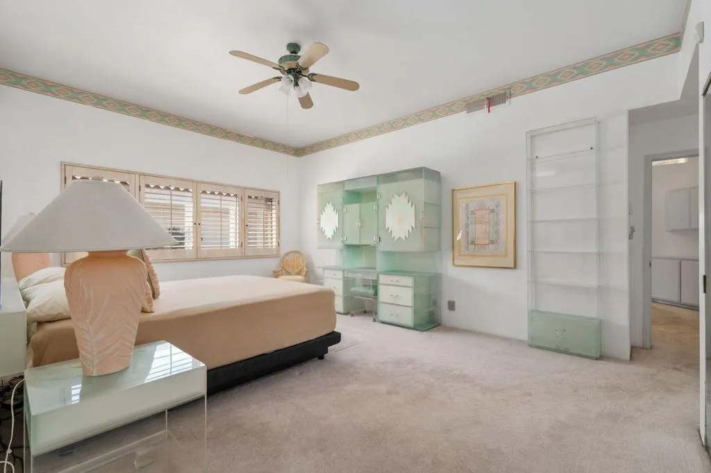 Rarely available Mission Hills East Condo with unobstructed Triple Fairway & San Jacinto Mountain Views! Situated on the 18th Fairway of the Westin Mission Hills Resort Pete Dye Golf Course and you own the land. This well located residence features original finishes and a spacious layout with great potential to update and make your own. Light filled Great Room opens directly onto the rear patio perfect for entertaining and enjoying the year-round sunsets. WIth 2 generous bedrooms and baths plus Den/Office offer an excellent opportunity for a full-time home, seasonal retreat, or investment property. The kitchen features breakfast bar and a stunning view through the oversized frameless windows Mission Hills Country Club offers world-class amenities, including three private golf courses, pickleball, tennis and fitness center, and access to the Westin Rancho Mirage Golf Resort & Spa. Memberships are available. HOA includes exterior and roof maintenance, landscaping, trash service, high-speed cable and internet, and four community pools. Furnishings are available outside of escrow.