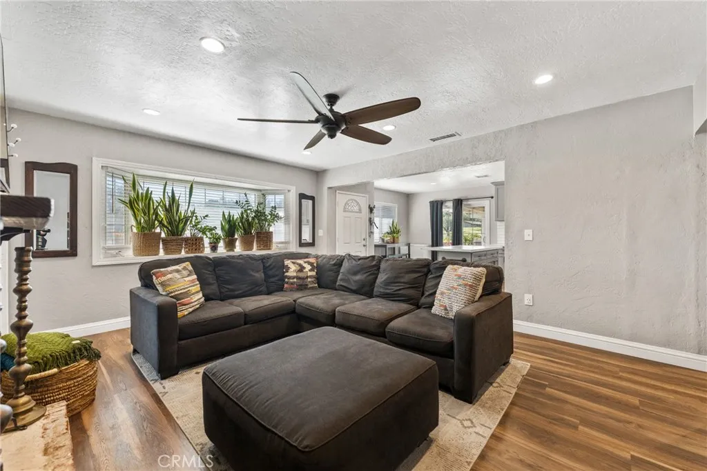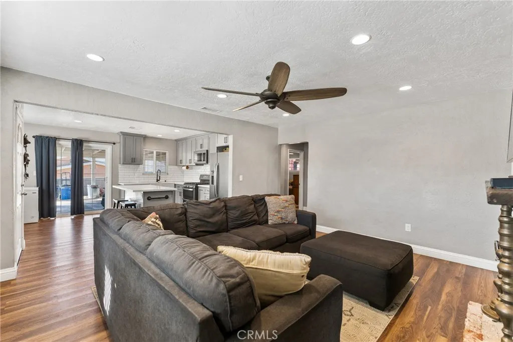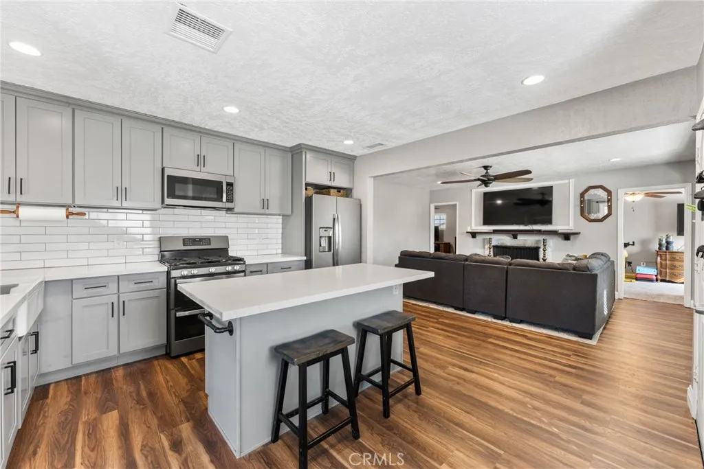 Fully remodeled single-story home situated on an oversized lot offering space, upgrades, and versatility. The open concept layout features a beautifully upgraded kitchen with quartz countertops, custom shaker cabinetry, subway tile backsplash, farmhouse sink, stainless steel appliances, and a large center island perfect for entertaining. The home offers wood-style flooring, recessed lighting, modern fixtures, and updated bathrooms creating a clean contemporary feel throughout. Step outside to an entertainer’s backyard featuring a large concrete patio, a custom gas fire pit with built-in seating, and a beautiful wood-beam gazebo structure ideal for outdoor gatherings. The expansive lot provides plenty of room for RV parking, work vehicles, toys, or future improvements. Additional upgrades include a 200-amp electrical panel, 50-amp RV hookup, and a 40-amp EV charger. A 48-foot storage container is also included providing excellent space for storage, workshop use, or equipment.