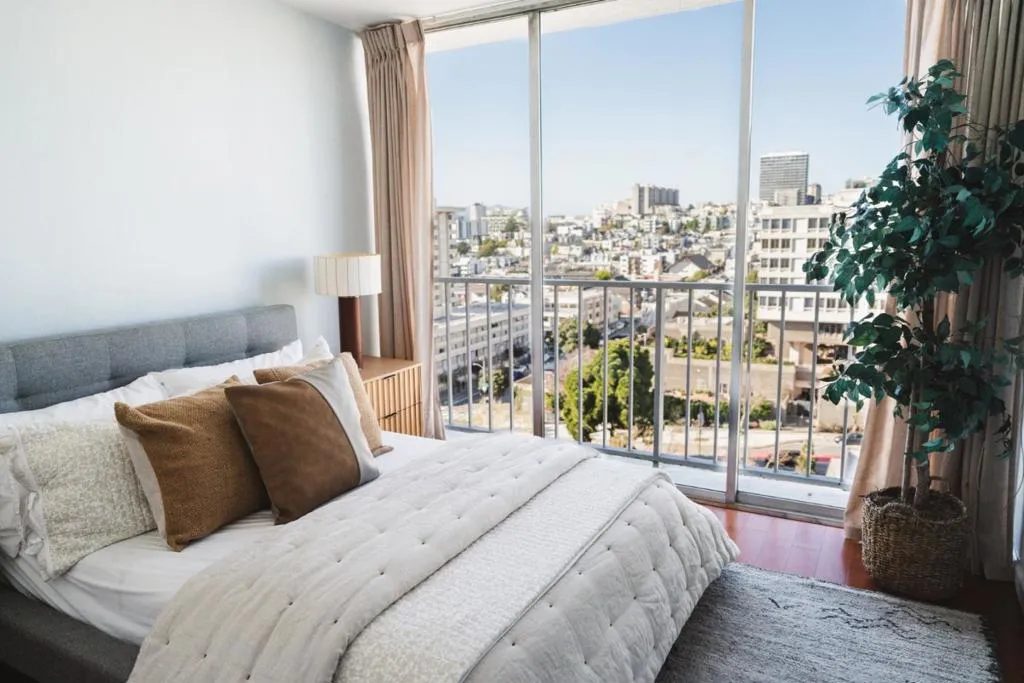 Welcome to this charming 3-bedroom, 2-bathroon home, in a mid-century Eichler designed 18-story building. This 12th floor unit offers vibrant and stunning views of the SF city, including the iconic Transamerica building and Japan town. With well-designed living space, this residence offers ready-to-move-in and relaxing city living. Enjoy the inviting ambiance of the combined living and dining room, with abundant natural light, private balcony, and floor-to-ceiling windows. All bedrooms are well lit and designed with a small balcony. Spacious primary bedroom suite and two additional bedrooms offer flexibility for guests and/or for home offices. The kitchen features a granite countertop, updated cabinets, and stainless-steel appliances. Practical amenities include radiant heated wood floor and with a separate laundry room, provide extra storage space. Centrally located in the Cathedral Hill neighborhood with 99 Walk Score and 90 Transit Score. The home is steps from Japan town and with easy access to public transit, Fillmore Streets shops, dining, and entertainment. Enjoy the luxury and convenience of a 24-hour lobby security desk and package service, 1 assigned parking space in gated secure garage parking and an outdoor sport court.