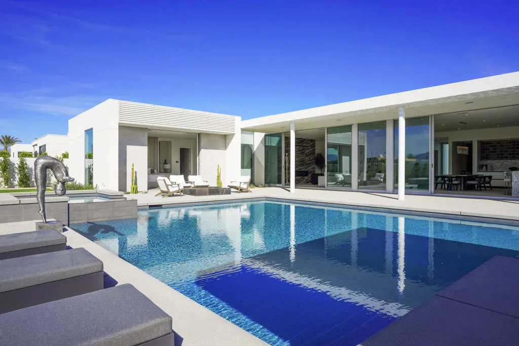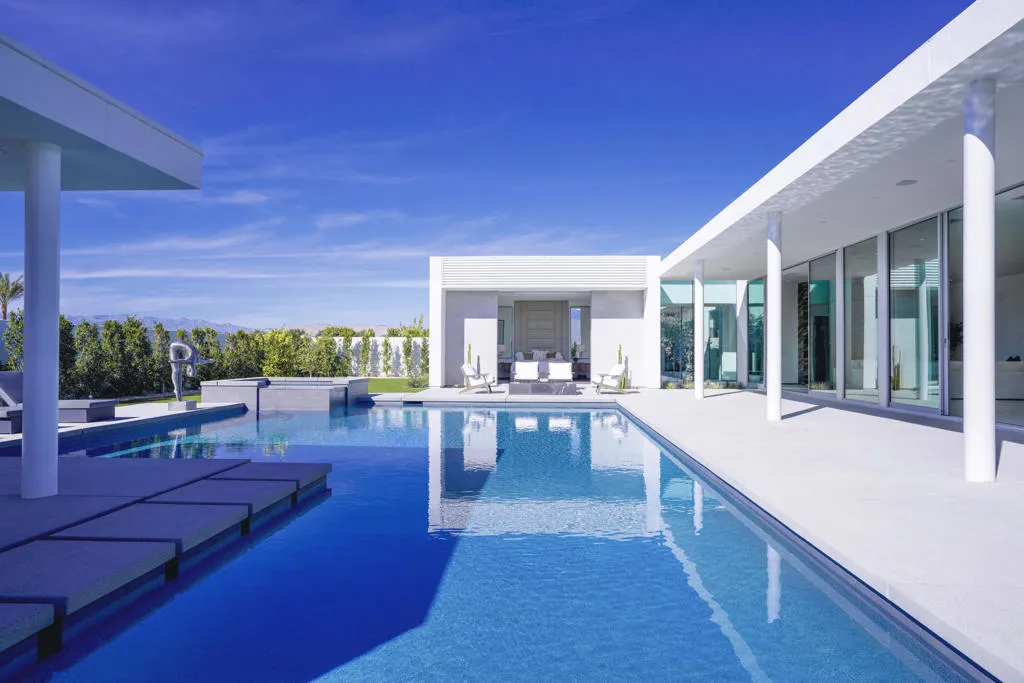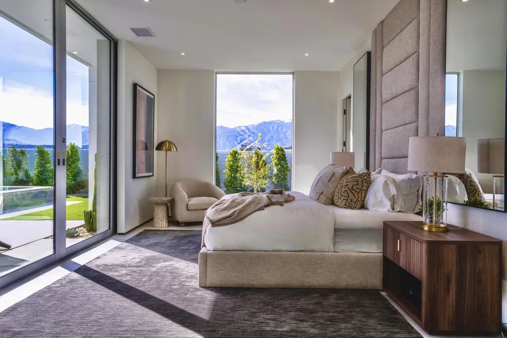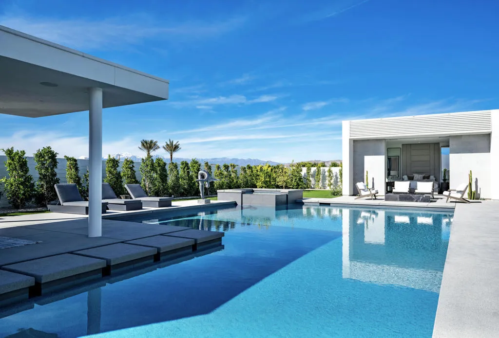NEW CONSTRUCTION - Residence Fifteen in Linea Rancho Mirage presents the essential qualities of desert resort architecture--providing a long central pavilion with a series of flexible living spaces throughout. Our interior design team created striking classic modernist ambiance with elegant designer accents. The impressive west view home captivates drama and nature, with extensive indoor/outdoor connections, outdoor luxury living and entertaining spaces. The large plate glass hallway to the Primary Suite reinforces the cubic design thesis separating the north wing from the main house with an exciting transparent connection adding intriguing vistas to it's surrounding desertscape throughout the residence. Exterior details are created in steel trellis work for privacy and evening light diffusion creating a stunning lit night facade; and a shade cabana appears floating gracefully along the oversized L-shape pool for gathering and making reflections of its sculptural composition. Presented by the renowned award winning builder group, Alta Verde Builders, this 4,119 square foot 4 bedroom 5 bath home is ready to become your desert oasis.