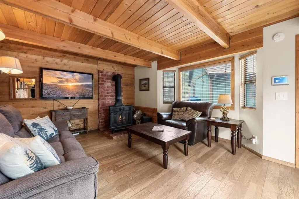 Escape to the mountains in this charming Big Bear cabin, being sold fully furnished and ready to enjoy! This cozy retreat has everything you need for the ideal mountain getaway or vacation rental. Step inside to a warm and inviting living room featuring a Franklin wood-burning fireplace, perfect for those snowy Big Bear evenings. The kitchen has been beautifully upgraded with granite countertops, stainless steel appliances, and knotty pine cabinets, giving it that perfect blend of modern comfort and classic mountain charm. The bathroom is tastefully updated with modern tile, new fixtures, and a relaxing jetted bathtub--the perfect place to unwind after a day on the slopes or hiking the trails. With two oversized bedrooms that can accommodate multiple beds, there's plenty of room for guests, making this an ideal vacation home or income-producing rental. Step outside and enjoy summer BBQs on the spacious deck, accessible from both the kitchen and living room. The property also offers plenty of parking for two or more cars plus additional storage space beneath the home. Tucked away on a short private road and just steps from the National Forest, this cabin offers the peace, privacy, andmountain lifestyle you've been looking for in Big Bear.
