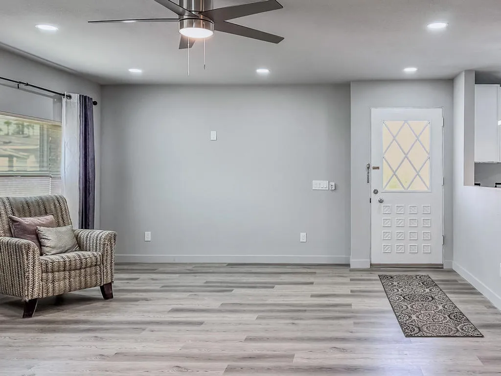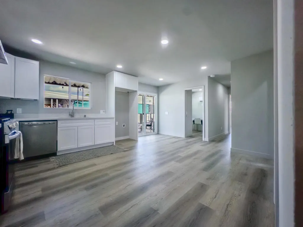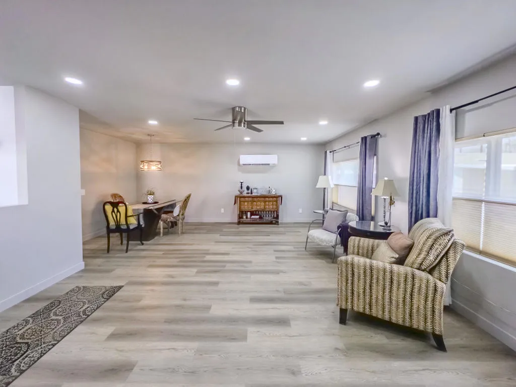 Welcome to this beautifully updated 3-bedroom, 2-bath mobile home offering 1,440 sq. ft. of comfortable living in a desirable 55+ community, ideally located close to shops, dining, and local amenities. Freshly painted with a charming stucco exterior, the home boasts a bright, open floorplan that seamlessly connects the kitchen and living areas, perfect for everyday living and entertaining. The spacious primary suite features an ensuite bathroom, while a second bedroom enjoys direct access to the hall bath, creating a flexible layout. One of the bedrooms is ideal for a home office, adding versatility to the space. The kitchen shines with solid-surface countertops and flows into the living area for a modern, airy feel. Each bedroom and the living room are equipped with efficient mini-split systems for personalized comfort. A brand-new patio welcomes you at the entrance, and the convenience continues with an in-unit washer and dryer. Enjoy your own private driveway with a covered carport, offering ease of parking and additional shade.This move-in ready home blends functionality, comfort, and location into one incredible package within a peaceful age-restricted community. Space rent is approximately $825 per month (buyer to verify with park management).